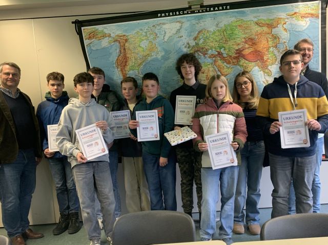 Die Klassengewinner des Diercke Wissen Wettbewerb 2025 (von rechts nach links) zusammen mit Schulleiter Fabian Borys und Lehrer Peter Peil: Ruben Stamm (10b), Lucie Bause (10c), Emma Hanses (7b), Noah Schäfer (9a), Clemens Tröster (7a), Samuel Brouwer (8c), David Dommes (10a), Alexandros Hanses (9d), Jonas vom Orde (9b); es fehlen: Jannis Schröder (7c), Irem Erdogan (8a), Lea Baumeister (9c) sowie David Schürholz (8b). Weiterlesen