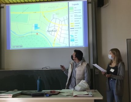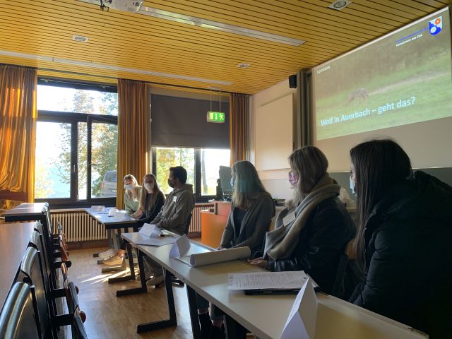 Im fiktiven Ort „Auerbach“ wurde ein Wolf gesichtet. Die Aufgabe der Schüler:innen bestand darin, einen Aktionsplan für den Umgang mit dem Wolf aufzustellen. Dafür schlüpften sie in die Rollen verschiedener Interessengruppen. Sie spielten Anwohner:innen, Jäger:innen, Naturschützer:innen oder Schäfer:innen. Ein Bürgermeisterteam übernahm die Verantwortung für die Durchführung der regelmäßig stattfindenden Bürgerversammlungen.