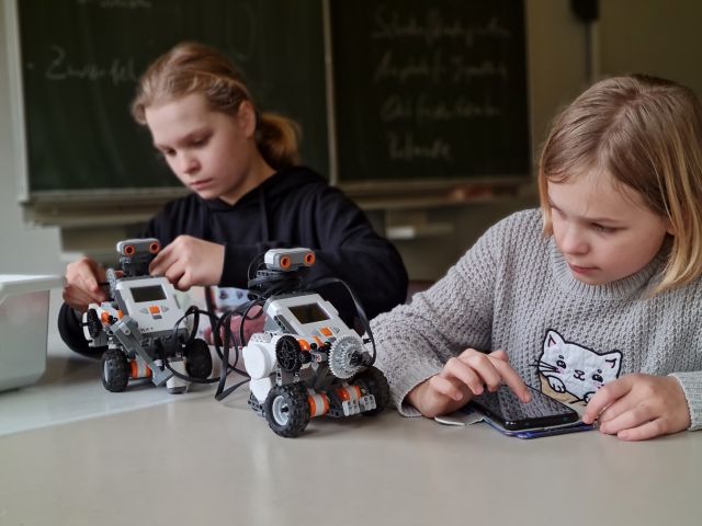 Bereits in der Jahrgangsstufe 5 können die Schülerinnen und Schüler in der Roboter AG auf eine spielerische Art und Weise erste Erfahrungen mit technischen Konstruktionen von LEGO Mindstorms Robotern sammeln. In der Jahrgangstufe 6 erstellen sie im Rahmen des Faches Informatik dann erste Algorithmen und führen kleinere Programmierungen in Scratch durch. Für eine Spezialisierung im Bereich Technik in der Mittelstufe bietet das Gymnasium neben dem Fach Informatik seit 2017 in Zusammenarbeit mit der Deutsche Telekom Stiftung und regionalen Unternehmen die Junior Ingenieur Akademie (JIA) als Wahlpflichtfach in der 9. und 10. Klasse an. Neben Vertiefungen in der Konstruktion und Programmierung von Robotern mit LEGO-Mindstorms Systemen stehen in der JIA die Umwelttechnik mit Schwerpunkt erneuerbare Energien, die Steuerungstechnik und die Produktentwicklung im Vordergrund. Seit 2021 fungiert das Gymnasium Maria Königin in Kooperation mit der Universität Siegen zudem als sogenannter Solver Hub im Projekt MINTpro2Digi. In diesem Projekt können Schüler aller Jahrgangsstufen ab Klasse 7 an realen mathematisch-technischen Problemstellungen, die von Unternehmen und Firmen aus der Region Lennestadt/Olpe/Siegen gestellt werden, arbeiten und ihre Ergebnisse schulübergreifend vorstellen. In diesem Zusammenhang wurden die Schülerinnen Theresa Hickmann und Lina Reifenberg für die Ansteuerung eines Robotergreifarms in Zusammenarbeit mit der Firma Bäumer (Freudenberg) im Oktober 2021 vom MINT Netzwerk zdi.NRW ausgezeichnet.