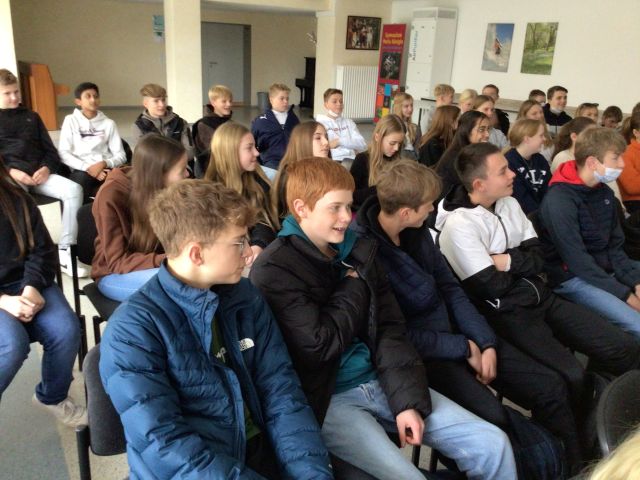 Überhaupt wirkt der junggebliebene Mann sehr sympathisch und offen und lernt um der besseren Kommunikation Willen zuallererst die Namen aller anwesenden Schülerinnen und Schüler auswendig. „So habe ich das Gefühl, dass unsere Begegnung persönlicher ist“, sagt er dazu. Und damit sich das Erinnern an die vielen Namen und Gesichter auch lohnt, erfinden die Klassen 8a und 8c im freien Gedankenspiel unter Wortmeldungen und Namensnennungen eine gemeinsame Geschichte zum Titel „Der schwarze Ritter“. Nach einer halben Stunde voller Magie, heldenhafter Ritter mit Superkräften, fliegender Pferde, enthaupteter Königinnen und Könige sowie verliebter Drachen hat Sir Henry le Blanc den schwarzen Ritter nicht aufhalten können und er wird wohl noch in einer Fortsetzung, die wir irgendwann vielleicht einmal von unseren Schülern aufgeführt hören dürfen, sein Unwesen treiben. „Wisst ihr eigentlich, was ihr da gerade gemacht habt?“, will Herr Wortberg wissen. Ganz klar: Eine Geschichte „geschrieben“.