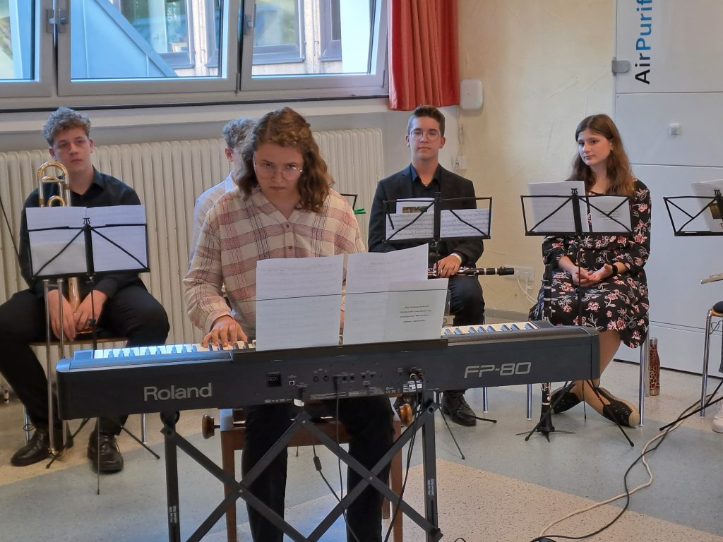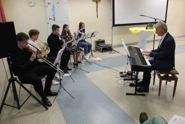 Die musikalische Gestaltung der Veranstaltung übernahmen Theresa Kaiser am Klavier und ein Bläserensemble des Gymnasiums Maria Königin unter Leitung von Berthold Kresin mit den Schülern Henry Assmann, Nele Jaspers, Philipp Krämer, Jonathan Regeling und Pauline Witte.