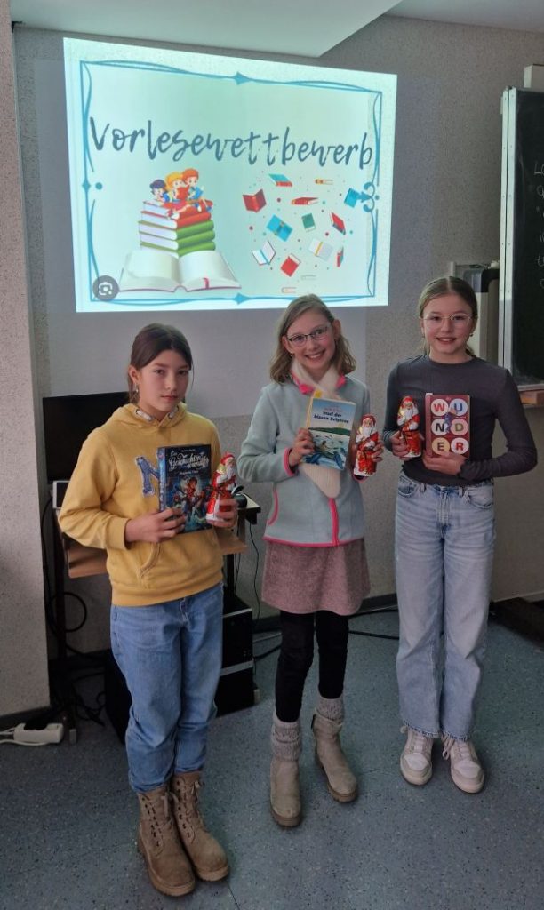 Sie bekamen nun die Aufgabe, einen eigenen Text aus einem selbstgewählten Buch und einen vorgegeben Fremdtext überzeugend, gut betont und sinnstiftend vorzulesen. Die dreiköpfige, aus Deutschlehrerinnen und -lehrern bestehende Jury befand nach eingehender Bedenkzeit, dass Lena Kramer den Titel „Schulsiegerin“ bekommen sollte. Gleichzeitig hat sich Lena damit für die nächste, kreisweite Runde qualifiziert. Alle drei Siegerinnen erhielten ein Buchgeschenk und einen Schokoladennikolaus als Anerkennung und Ansporn zum fleißigen Weiterlesen.
