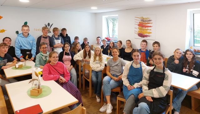 Es war schön zu sehen, wie fleißig und motiviert sich die Klassen an das gemeinsame Kochen herangetraut haben. Alle Schülerinnen und Schüler waren mit vollem Einsatz dabei und hatten großen Spaß am gemeinsamen Zubereiten der Gerichte. Ohne allzu großen Aufwand wurde etwas Leckeres und Gesundes aus vielfältigen Zutaten zubereitet. Es wurden auch neue Lebensmittel entdeckt. Ein mediterraner Nudelsalat, ein fruchtiger Spitzkohlsalat sowie pikant marinierte Kartoffeln, Kürbisse und Süßkartoffeln aus dem Ofen standen auf der Speisekarte. Abgerundet wurde das Menü durch zwei Nachtischvarianten: ein beeriges Schichtdessert und leckere Waffeln. Letztere einmal ganz anders – nämlich mit Dinkelvollkornmehl, Hafermilch und geriebenem Apfel. Mit diesen tollen Rezepten haben die Schülerinnen und Schüler gemeinsam ein besonderes „Ess-Erlebnis“ schaffen können. Das Schlemmen und Genießen nach getaner Arbeit war dabei natürlich das Allerschönste! Alle Klassen haben zur Erinnerung ein Rezeptheft mitsamt Fotos vom Kochevent erhalten. So können die leicht gelingenden, vollwertigen Rezepte zukünftig auch zuhause nachgekocht werden. Die Schülerinnen und Schüler waren sich zu 100 Prozent einig: das Projekt soll in jedem Fall auch in den nächsten 9er-Klassen angeboten werden.