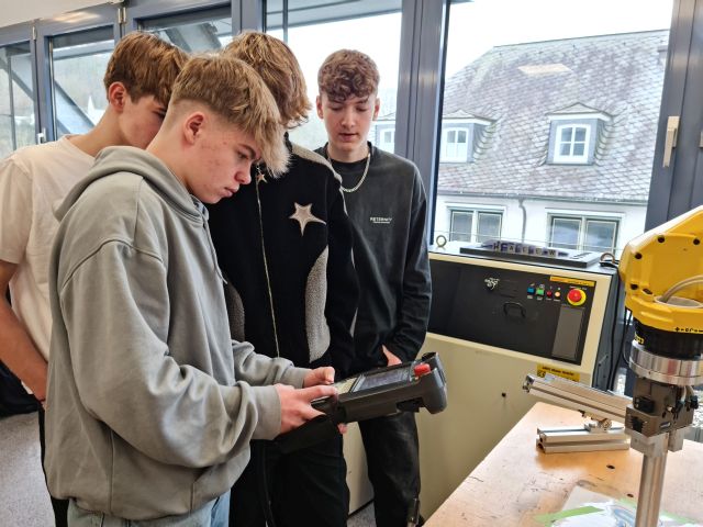 Der zweite Workshop konzentrierte sich auf die Ansteuerung und Programmierung eines industriellen Roboters. Die Schülerinnen und Schüler mussten sich in das komplexe Steuerungssystem einarbeiten, eine Ablaufsteuerung entwickeln und dabei auf ihre Vorkenntnisse im Bereich der Programmierung von Robotern und Koordinatensysteme der Mathematik zurückgreifen. Die abschließende Projektaufgabe bestand darin, das MK-Logo von einem Roboter zeichnen zu lassen.