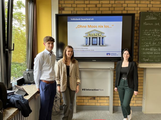Drei Auszubildene der Volksbank Sauerland besuchten jetzt die fünften Klassen, um ihnen die Welt des Geldes etwas näherzubringen. Die drei Azubis Helena Vormweg, Mara Schmidt und Marten Schelle, alle drei ehemalige Schüler vom Gymnasium Maria Königin, hatten für den Vormittag Antworten auf Fragen wie „Was ist Geld?“, „Wo kommt es her und wo geht es hin?“ und „Wie kann ich sparen?“ vorbereitet.