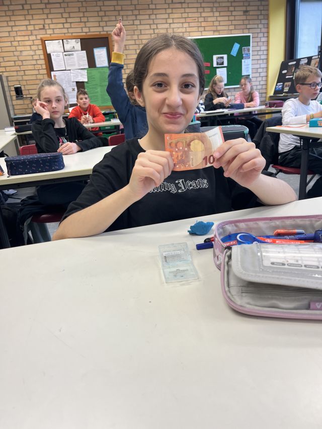 Doch auch die Fünftklässler hatten schon viel Vorwissen und wollten einigen Dingen näher auf die Spur kommen. So interessierten sie sich besonders für die Sicherheitsvorkehrungen einer Bank, aber auch dafür, wieviel Geld im Umlauf ist und wie man am besten ein teures Fahrrad finanzieren kann. Besonders aktiv wurden sie, als sie die Sicherheitsmerkmale der Geldscheine untersuchten und Falschgeld enttarnen lernten. Am Ende des doppelstündigen Workshops konnten die Kinder dann ihr neu erworbenes Wissen mithilfe eines Quizzes unter Beweis stellen. „Am besten hat mir das Quiz gefallen“, meldete Silas aus der 5c sich zu Wort. „Ich fand, Sie haben alles gut erklärt und jetzt weiß ich viel mehr über Geld als vorher“, resümierte Pepe, ebenfalls aus der 5c, nach der gelungenen Doppelstunde.