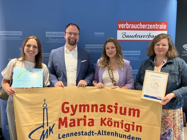 Die beiden heimischen Bundestagsabgeordneten Florian Müller (CDU) und Nezahat Baradari (SPD) hatten es sich nicht nehmen lassen, bei der Preisverleihung dabei zu sein und zu gratulieren. In einem Gespräch verwies Anne-Katrin Lingemann darauf, dass „nicht zuletzt durch das Projekt Servir Verbraucherbildung und der nachhaltige Umgang mit Ressourcen seit fast 40 Jahren im Schulalltag verankert sind“. Im Anschluss an die Preisverleihung fanden Workshops und eine Vernetzung mit den knapp 100 angereisten Schulen statt, bei dem die Lehrerinnen Dorothee Müller und Jennifer Stahl die vielfältigen Angebote des Gymnasiums Maria Königin vorstellten und interessierte Nachfragen beantworten konnten. Der Unterstufenkoordinator Dr. Frederik Linn wagte einen Blick nach vorne: „Diese vierte Auszeichnung als Verbraucherschule wird sicherlich nicht unsere letzte sein, denn durch diese heutige Vernetzung haben wir nochmal vielfältige neue Ideen sammeln können.“