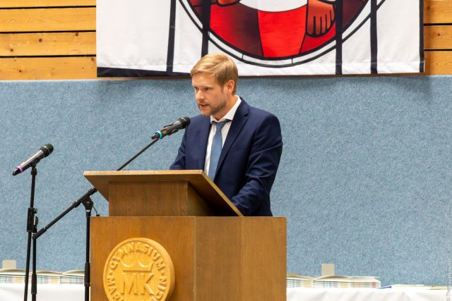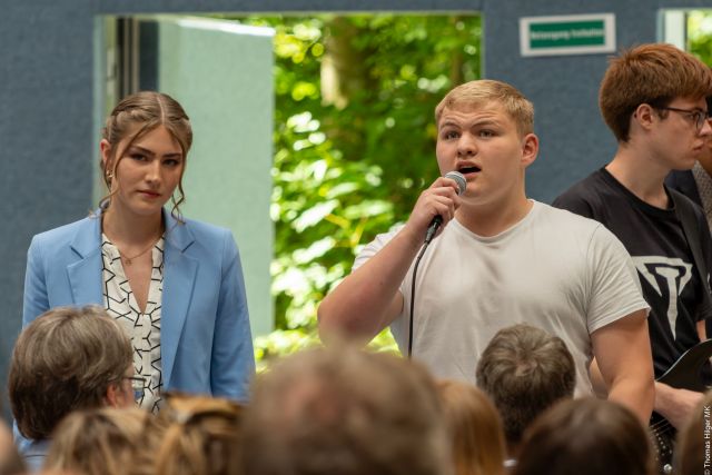 Manuel Vormweg hielt die Rede für die Stufenleitung und bezog sich auf das Abimotto.