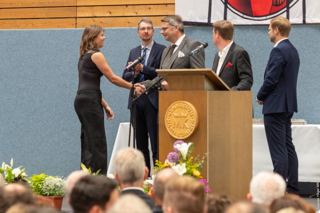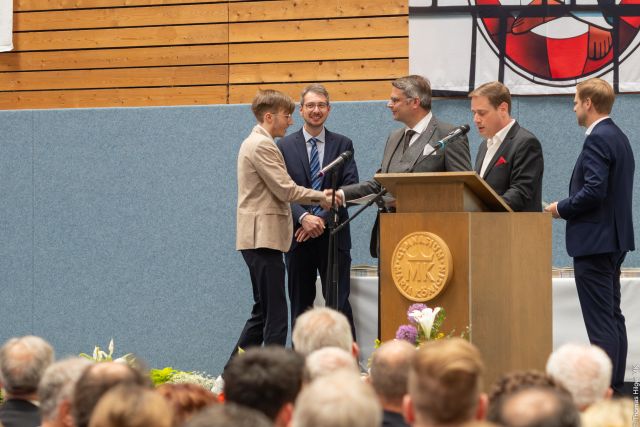 Die Abiturzeugnisse wurden von den Stufenleitern Manuel Vormweg und Peter Peil, dem Oberstufenkoordinator Timo Quast und Schulleiter Fabian Borys übergeben.