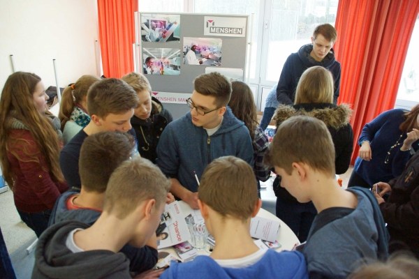 Elf Betriebe und Institutionen verschiedenster Branchen stellten am Dienstag, den 27.01.2015, an ihren Präsentationsständen ihre Ausbildungsmöglichkeiten und dualen Studiengänge vor, so z.B. die Kreispolizeibehörde Olpe, die Stadt Lennestadt, die Volksbank Bigge-Lenne, die Firmen Mennekes, Hensel, Viega, Tracto-Technik, Menshen und H&R Spezialfedern. In informativen Gesprächen mit den Auszubildenden und Ausbildungsleitern konnten die etwa 250 jugendlichen Messebesucher sich hautnah und kompetent informieren und wichtige erste Kontakte zu ihren möglichen neuen Arbeitgebern herstellen. „Ich war erstaunt über das große Interesse an unserem Stand“, so Georg Melcher von der Kreispolizei in Olpe, „wir kommen jederzeit gerne wieder“. Das war auch die Resonanz der anderen ausstellenden Betriebe, die die Veranstaltung für eine gute Ergänzung der Berufsmesse in Olpe hielten. Das niedrigschwellige Angebot eröffnet den Arbeitgebern eine hervorragende Möglichkeit sich den potentiellen Auszubildenden zu präsentieren, um das Interesse für geeignete Bewerber zu wecken. Spätestens seit der Schulzeitverkürzung auf zwölf Jahre streben immer mehr Gymnasiasten eine betriebliche Ausbildung an.