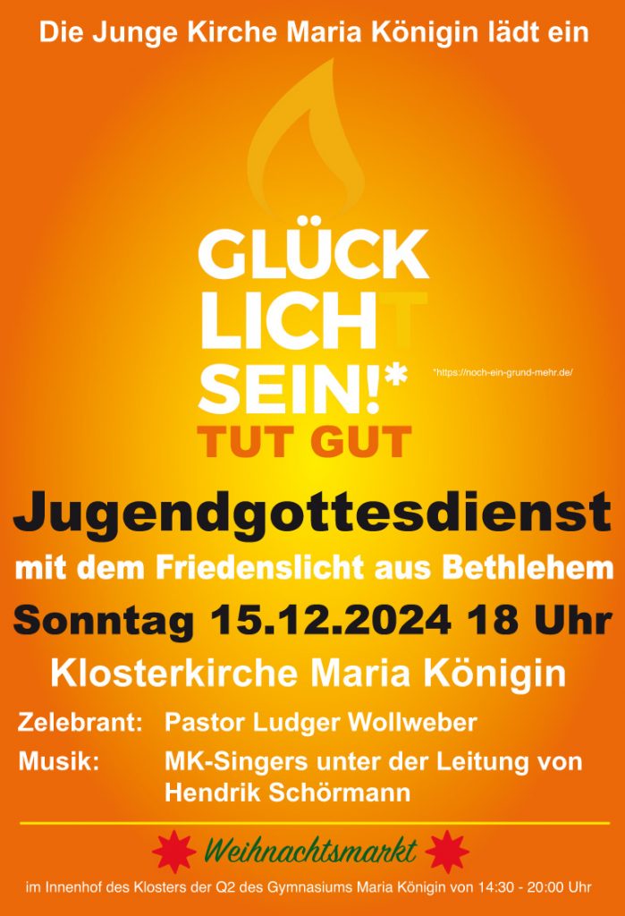 Der Gottesdienst am Sonntag, dem 15.12. beginnt um 18 Uhr und wird von Pastor Ludger Wollweber gefeiert, die musikalische Gestaltung liegt bei den MK-Singers unter der Leitung von Hendrik Schörmann. Vorbereitet wurde die Messe von Schülerinnen und Schülern aus der Oberstufe gemeinsam mit Peter Peil.
