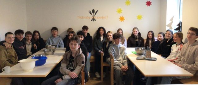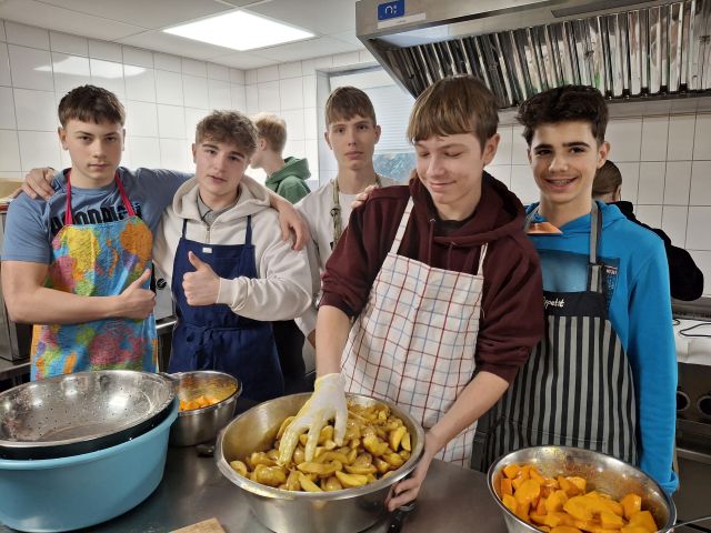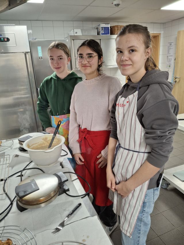 Also ging es in die Gemeinschaftsküche vom benachbarten Jugendhof. Alle Schülerinnen und Schüler waren beim Kochevent mit vollem Einsatz dabei und hatten großen Spaß am gemeinsamen Zubereiten der Gerichte. Ohne allzu großen Aufwand wurde etwas Leckeres und Gesundes aus vielfältigen Zutaten zubereitet. Dabei wurden auch neue Lebensmittel entdeckt. Ein mediterraner Nudelsalat, ein saftiger Spitzkohl-Möhren-Salat sowie pikant marinierte Kartoffeln, Kürbisse und Süßkartoffeln aus dem Ofen standen auf der Speisekarte. Abgerundet wurde das Menü durch ein raffiniertes Quark-Schichtdessert und leckere Dinkel-Apfel-Waffeln.
