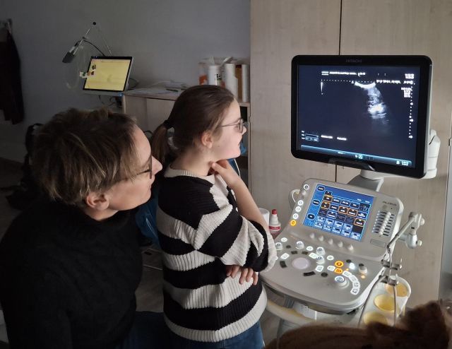 Und wie vermittelt man Aufbau und Funktionsweise des Körpers am besten? – Natürlich durch den direkten Blick hinein. Unter der fachlichen Anleitung von „Doc Katja“ wurde das Körperinnere der Mitschüler mit einem hochmodernen Ultraschall-Gerät genau unter die Lupe genommen. Dabei konnten die Jungen und Mädchen direkt ihr frisch erlerntes Wissen aus dem Unterricht anwenden. „Da ist die Aorta, die hat einen runden Querschnitt“, erkannten sie direkt. Oder: „Warum ist in der Gallenblase keine Flüssigkeit?“. Die prompte Antwort: „Weil der Schokoriegel von eben jetzt verdaut werden muss.“