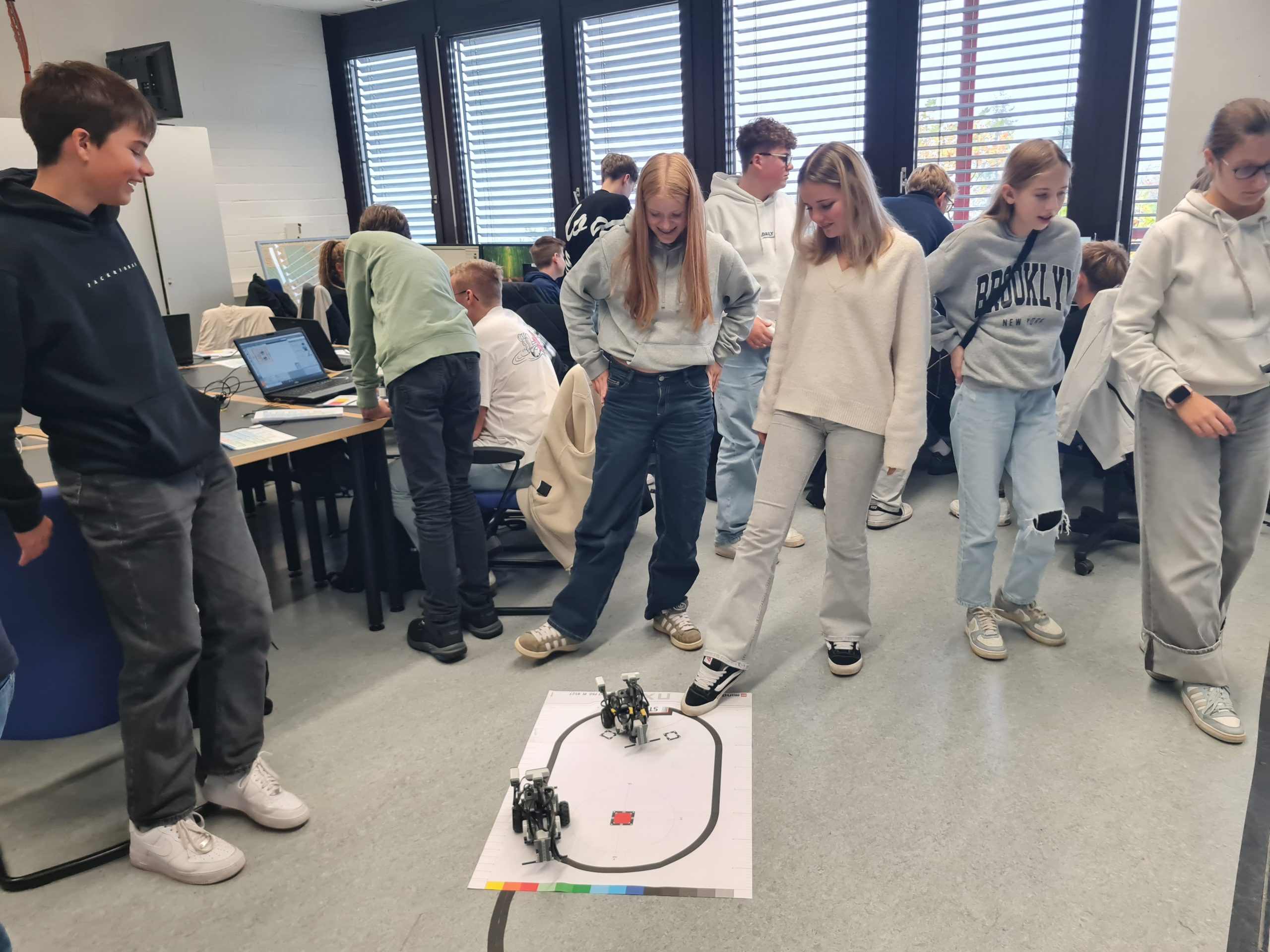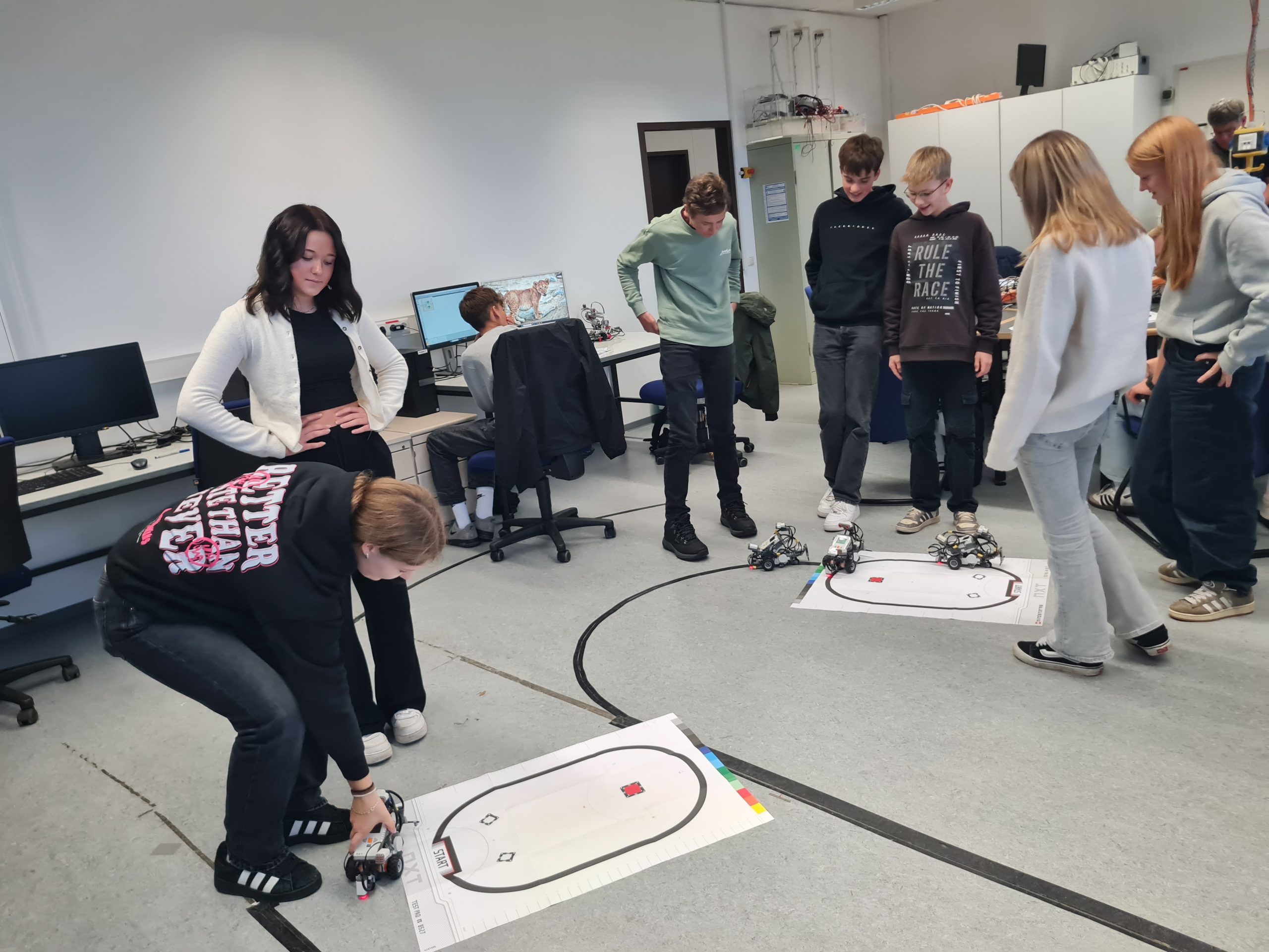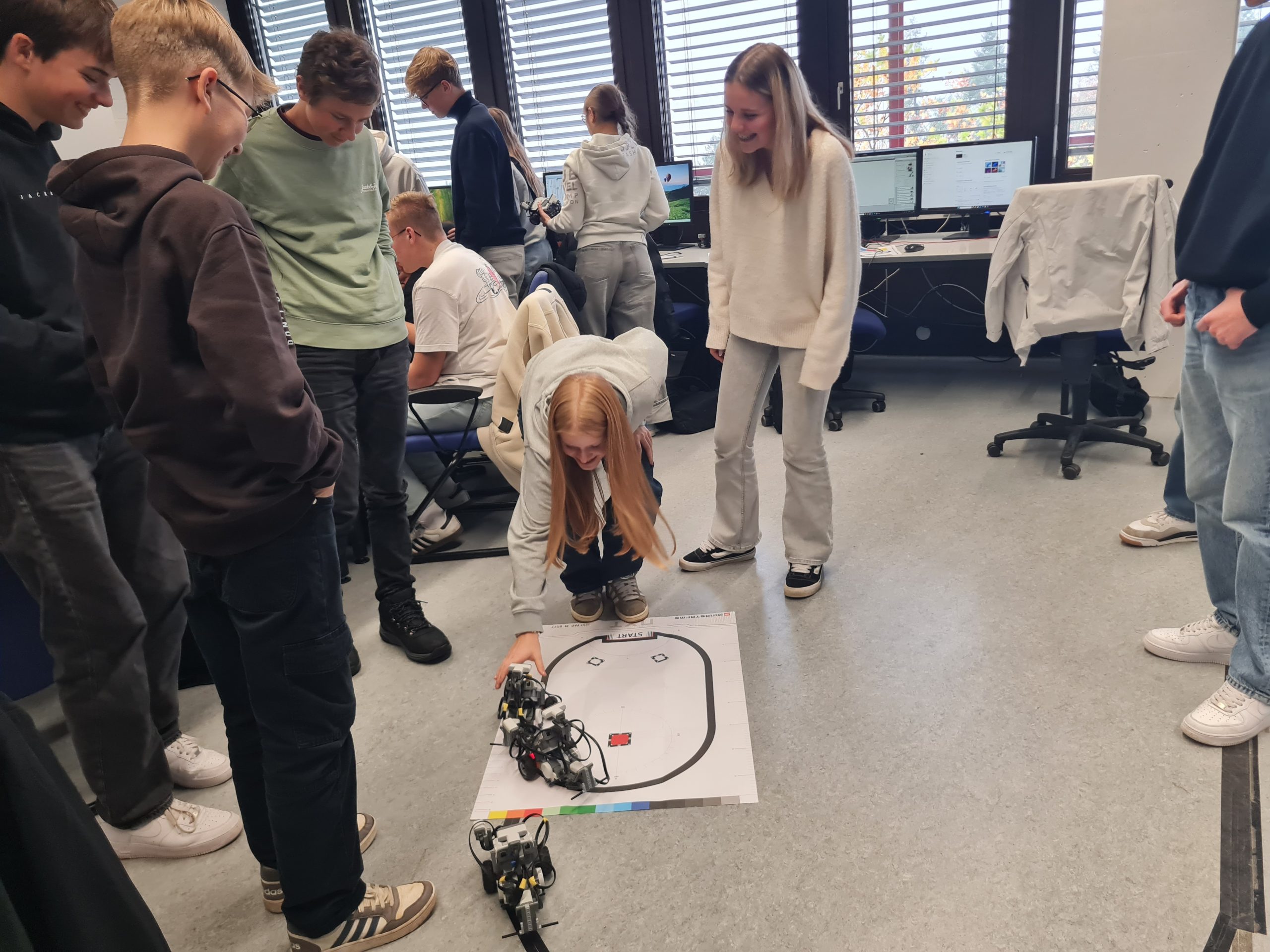 Die Schülerinnen und Schüler unserer Junior Ingenieur Akademie der Jahrgangsstufe 9 durften einen spannenden Tag an der Universität Siegen erleben! Im Robotik-Workshop programmierten sie eigene NXT-Roboter, lernten Sensoren, Aktoren und die Programmierumgebung kennen. Bei einer anschließenden Laborführung bekamen wir beeindruckende Einblicke in die Robotik-Forschung: von präzisen Industrierobotern bis hin zu riesigen Drohnen, die von Studierenden selbst entwickelt und gebaut wurden.