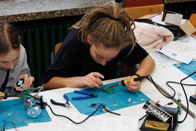 Am zweiten Tag stand das Thema Elektrotechnik im Mittelpunkt. Nach einem theoretischen Einstieg zu elektronischen Bauteilen – etwa zur Farbcodierung von Widerständen – konnten die Schüler auf vorbereiteten Platinen arbeiten. Mit verschiedenen Bausätzen wurden LEDs verlötet und zum Blinken gebracht. Helena Reichling brachte die Begeisterung der Teilnehmer auf den Punkt: „Es hat so viel Spaß gemacht, dass wir überhaupt nicht gemerkt haben, wie schnell der Tag vorbei war.“