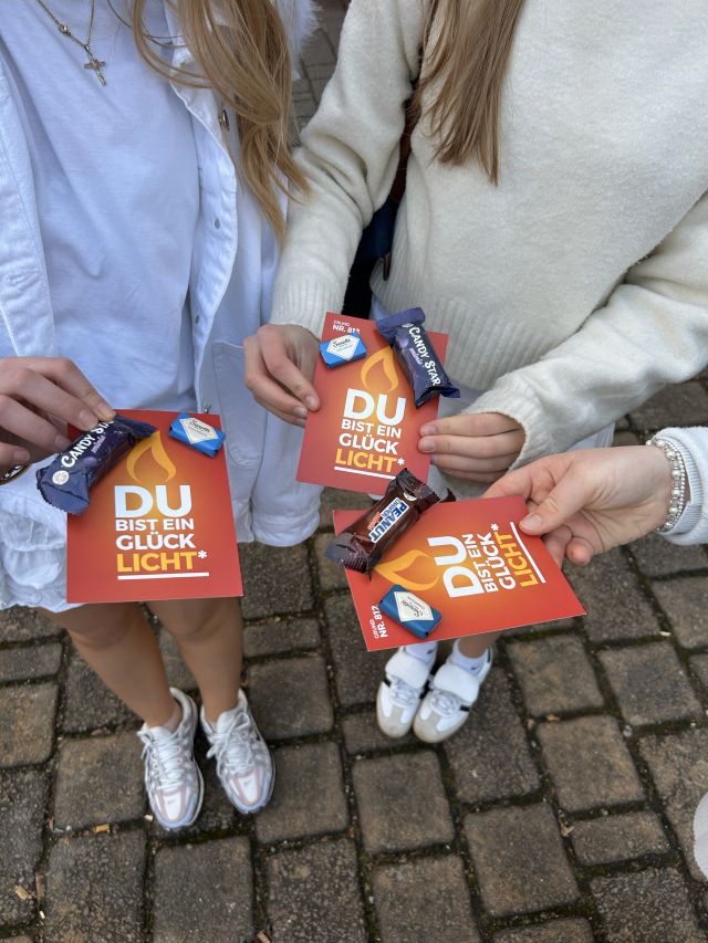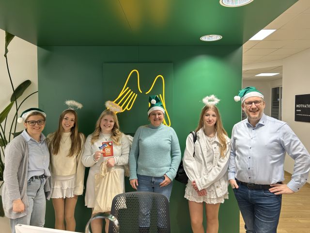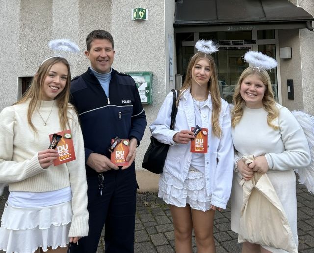 Mit einer besonderen Aktion überraschten drei Schülerinnen aus der Jahrgangsstufe 11 kurz vor Weihnachten Einrichtungen und Geschäfte in Altenhundem. In Engelskostümen überbrachten Hannah Krummenerl, Ida Hirschhäuser und Lea Koch ein Glückslicht an Menschen, die das ganze Jahr über Engel des Alltags sind. Sie besuchten das St. Josefs-Hospital, die Polizei, das Rathaus, eine Buchhandlung, eine Versicherung und andere Geschäfte.