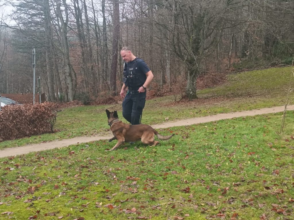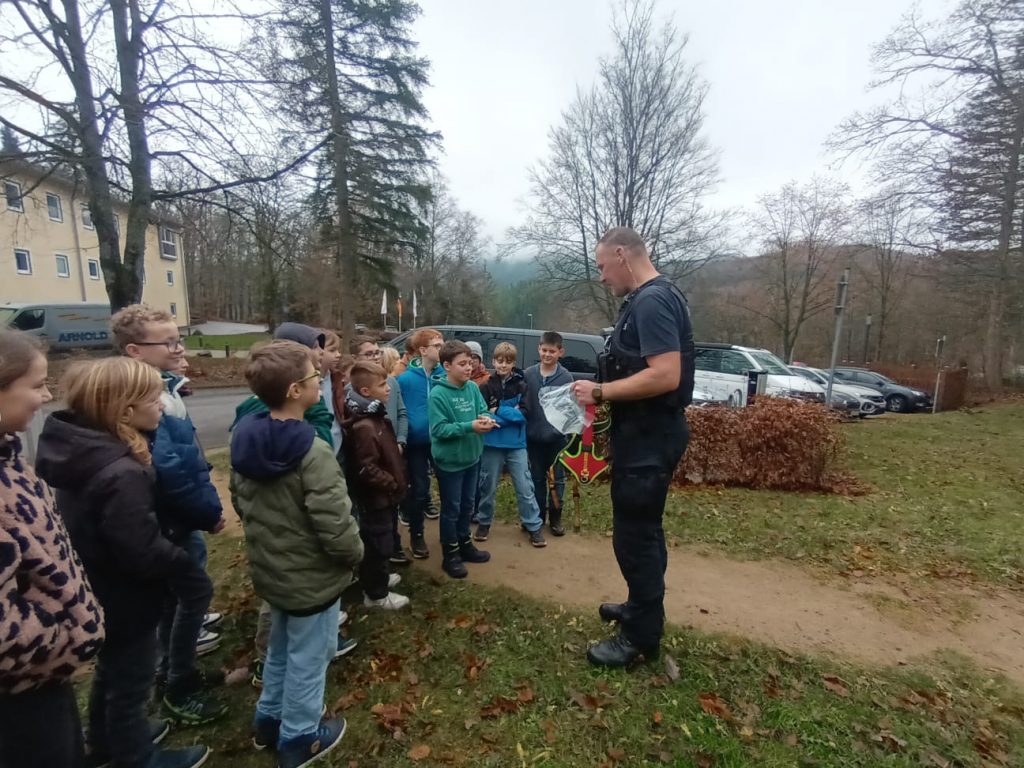 Patrick Lauer erklärte zunächst ausführlich, welche Aufgaben ein Diensthund hat, wie er ausgebildet wird und welche Bedeutung die Zusammenarbeit zwischen Hund und Hundeführer hat. Die Klasse durfte Myles aus nächster Nähe kennenlernen und erfuhr, wie wichtig Gehorsam, Vertrauen und regelmäßiges Training für die Arbeit im Einsatz sind.