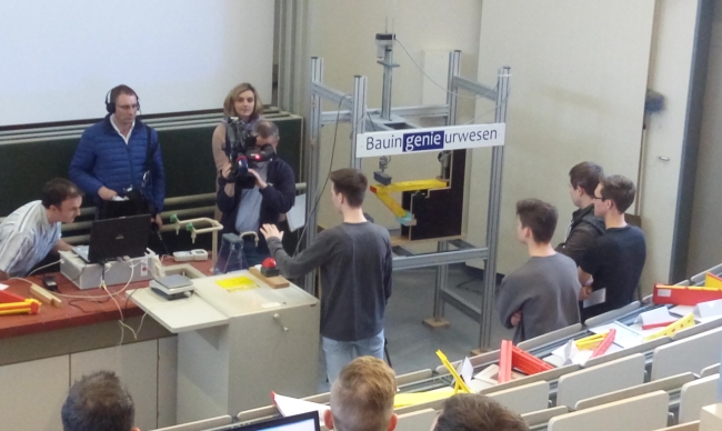 Am Entscheidungstag fuhren die Teams nun nach Siegen um bei der Belastungsprobe der Bauwerke dabei zu sein. In einer Prüfeinrichtung wird die Papierbrücke systematisch belastet, während eine Messsystem die Biegung sowie die getragene Last digital dokumentiert. Die erreichte Maximalbelastung wird schließlich noch in Relation zum Eigengewicht der Brücke gesetzt.