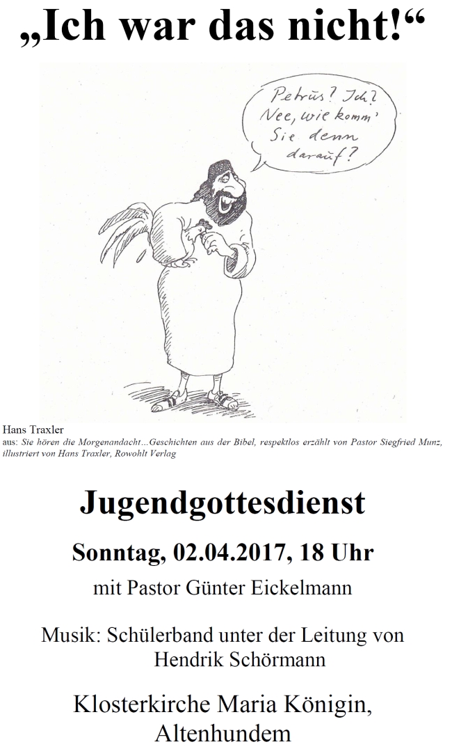 „Ich war es nicht!“ – unter dieses Thema hat das Team der Jungen Kirche den nächsten Jugendgottesdienst in der Klosterkirche Maria Königin gestellt.