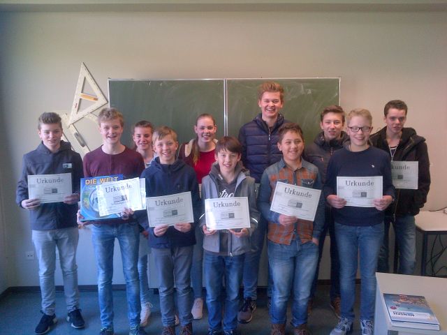 Fabian Wiese aus der 8c hat sein Wissen beim größten Geographie Wettbewerb Deutschlands erneut gezeigt. Im Schulfinale des Diercke Wissen Geographie-Wettbewerbs setzte er sich im Schulfinale gegen die anderen Klassensieger der Jahrgangsstufen 7 bis 9 durch: Moritz Vente (8b) und Gilbert Jung (9b) belegten knapp dahinter die weiteren Plätze.