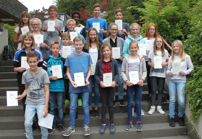 Das Foto zeigt die Besten Leichtathletinnen und Leichtathleten der Klasen 5-8 bei der Siegerehrung am Freitag 30.06.