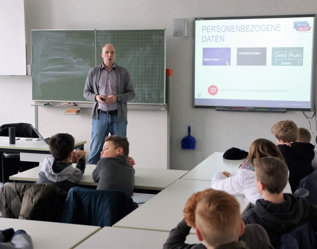 Am Montag, 22. Januar, besuchte Jörg Schönwälder, Datenschutz- und IT-Berater und Mitglied im Arbeitskreis „Datenschutz geht zur Schule“ im Berufsverband, die Fünftklässler unseres Gymnasiums. Auf dem Programm standen neben dem Datenschutz, personenbezogenen Daten, sicheren Kennwörtern und dem Urheberrecht auch durch die Schüler angesprochene Themen.