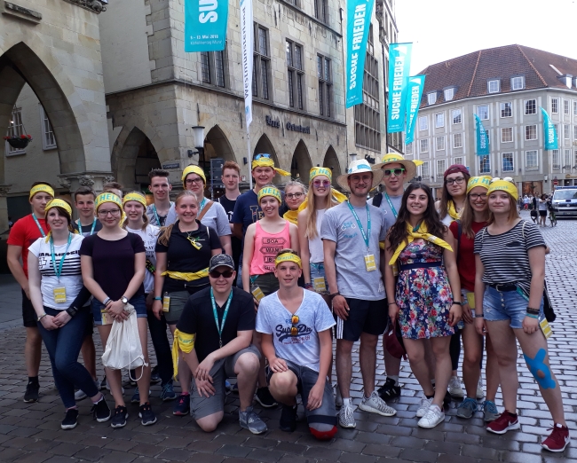 Fast 150 Jugendliche und ihre Begleiter waren bei diesem großen Katholikentreffen vor allem bei großen Diskussionsveranstaltungen in der Halle Münsterland eingesetzt. Sie erlebten bei weitgehend schönem Wetter einen fröhlichen, bunten und politischen Katholikentag und eine großartige Gastgeberstadt Münster, die ihrem Titel Friedensstadt voll gerecht wurde. Der Katholikentag unter dem Motto „Suche Frieden“ war ein großes Glaubensfest mit dem eindringlichen Appell, sich für Frieden, Toleranz und Nächstenliebe einzusetzen.