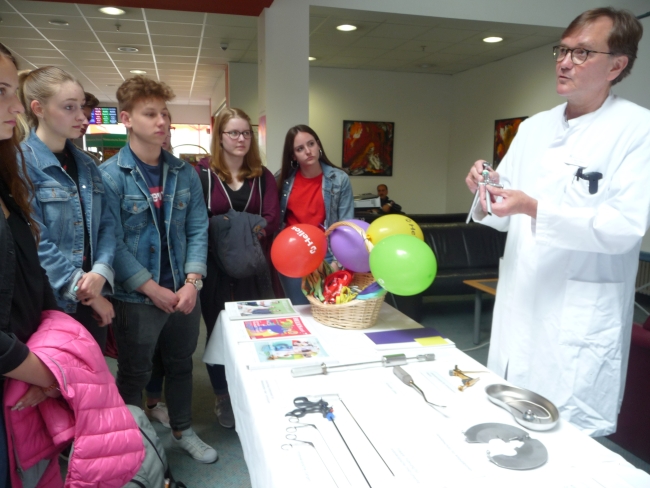 Der Biologie Leistungskurs der Qualifikationsphase 1 konnte Einsicht in die Arbeit eines Chirurgen bekommen. Mit Kurslehrerin Frau Mevenkamp besuchten wir die Helios Klinik in Attendorn, um den medizinischen Berufen ein Stück näher zu kommen. Dr. med. Klaus Friedhoff, Chefarzt Allgemein- und Viszeralchirugie, brachte uns seinen Beruf und seinen Ausbildungsgang näher.