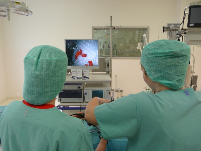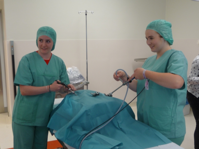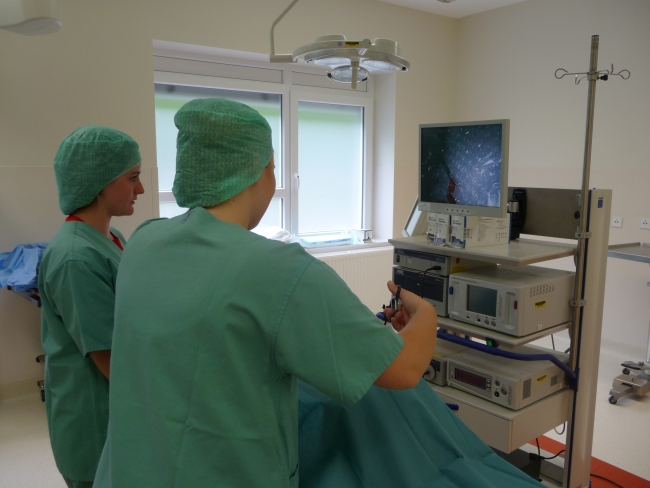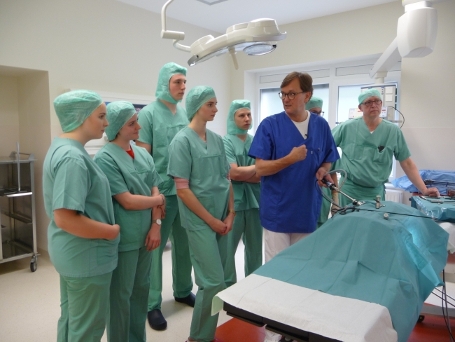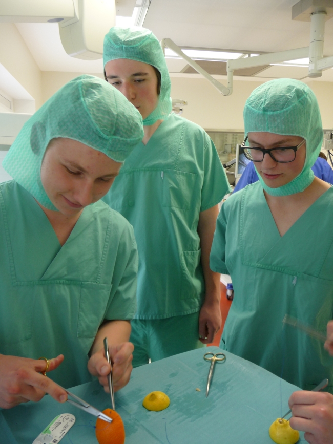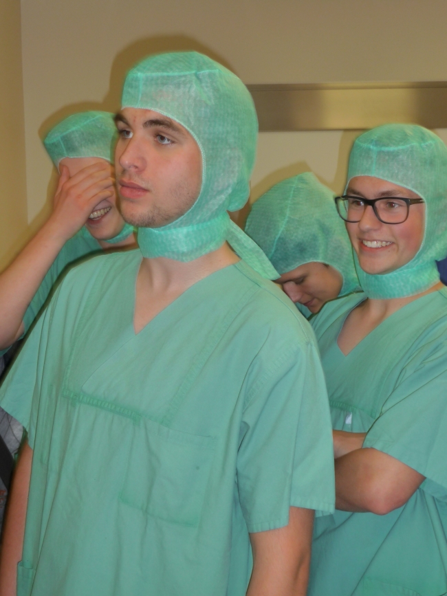 Nach einer Einführung in das OP-Besteck ging es dann in die Umkleide, wo für die angemessene, OP-taugliche Kleidung gesorgt wurde. Im Operationssaal angekommen, wurden uns die Geräte für eine endoskopische Operation oder auch „Schlüssellochchirurgie“ erklärt und wir konnten dann auch selbst Hand anlegen. Um mit den OP-Geräten zu hantieren, wurde eine Operation an Gummibärchen vorgenommen beziehungsweise an diesem Modell der Operationsvorgang nachgestellt.