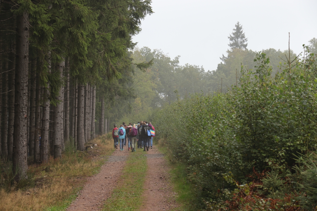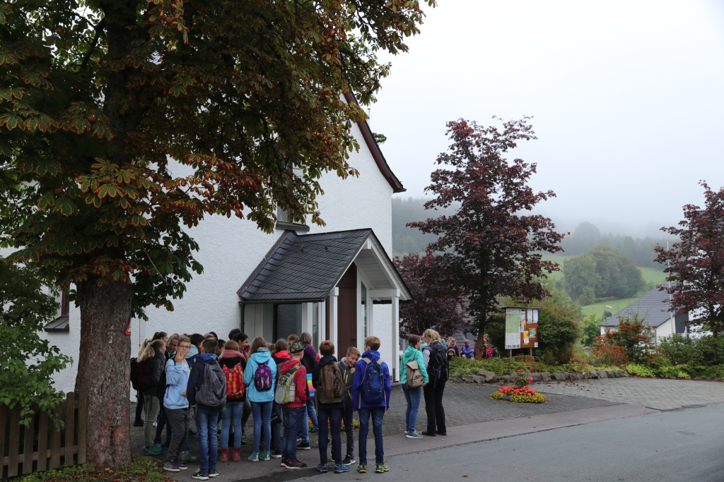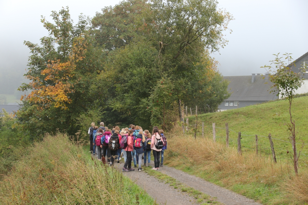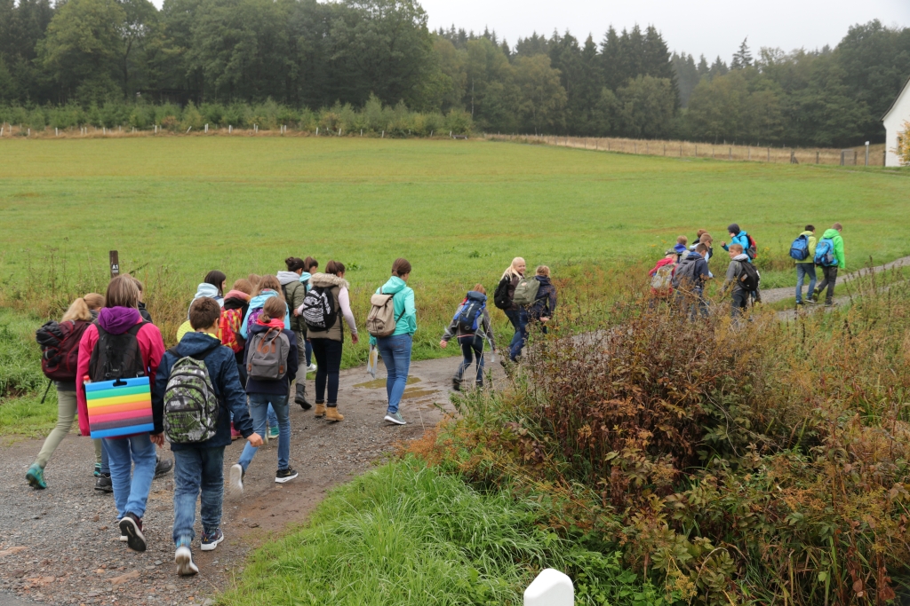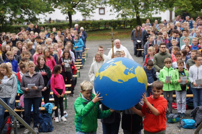 Ein großer Erdball als Symbol für die bedrohte Erde stand im Mittelpunkt der Wallfahrt des Gymnasiums Maria Königin zum Kohlhagen. Mehr als 700 Schüler und Lehrer pilgerten von unterschiedlichen Ausgangspunkten zum Marienwallfahrtsort, um dort gemeinsam mit Pfarrer Heinrich Schmidt den Namenstag der Schule zu feiern. Die Freude über die Schönheit der Schöpfung, aber auch die Sorge um die Zukunft unseres Planeten prägten den Gottesdienst. Mit der Aussage „Wir müssen alle ärmer werden!“ weist Papst Franziskus darauf hin, dass wir in den reichen Ländern nicht mehr so weiterleben können, wenn die Erde und die Menschen der Welt eine Zukunft haben sollen. Diese Gedanken nahm auch Pfarrer Schmidt auf und appellierte an die Schüler, sich einzusetzen. Dass diese dazu bereit sind, zeigten viele Vorschläge für konkrete Verhaltensänderungen, die die Klassen und Kurse auf dem Weg zum Kohlhagen gesammelt hatten. Dabei wurden u.a. genannt: Mehr Fahrrad fahren, Plastik-Müll vermeiden, Energie sparen, weniger Auto fahren, sich für Tierschutz und seltene Tierarten einsetzen und weniger Wasser verbrauchen. Diese Ideen, die als Blüten gestaltet gesammelt wurden, werden im Laufe des Schuljahres wieder aufgegriffen werden.