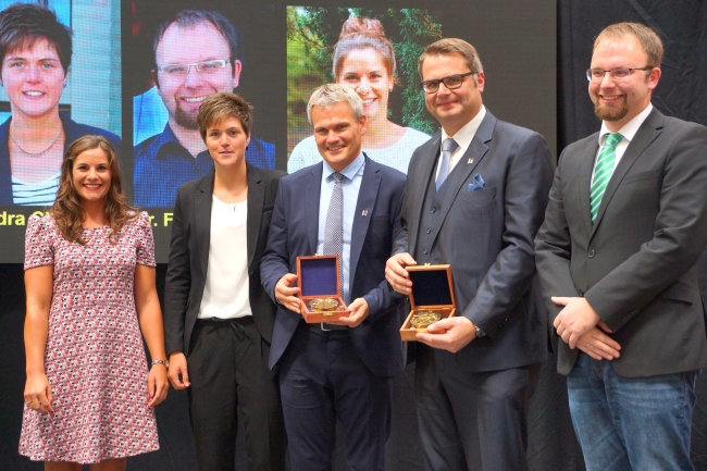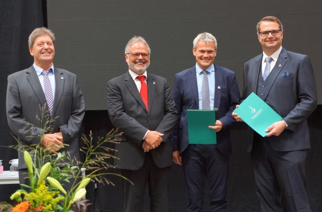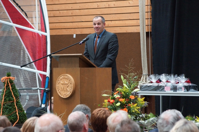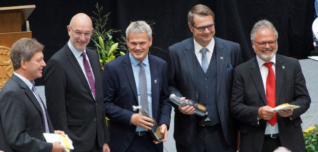 „Es gibt Tage, die das Leben einer Schule nachhaltig prägen und bereichern. Heute ist einer dieser Tage.“ Diese Formulierung von Andreas Bölker, dem Vorsitzenden des Trägervereins Gymnasium Maria Königin, ließ sich auch auf die Einführung der neuen Schulleitung beziehen. Fabian Borys und Christoph Tebrügge erhielten viele gute Wünsche für ihre neue Aufgabe. In allen Redebeiträgen klang aber auch die Gewissheit durch, dass diese beiden das Gymnasium als „starkes Team“ weiter gut führen werden. Der Lehrerrat überreichte ihnen jeweils einen Kompass, damit sie die Orientierung in den vielen Erwartungen und Ansprüchen nicht verlieren. Der Leitende Regierungsschuldirektor Dr. Stefan Werth nutzte Bilder aus dem Bergbau und wünschte ein herzliches „Glück auf!“ für die Neuen. Er warnte davor, nur das Bestehende zu verwalten. Wie unter Tage dürfe es keinen Stillstand geben, sondern man müsse die Schule ständig weiterentwickeln. Dass es dennoch in einer Zeit der Umbrüche keine Brüche geben werde, dessen war sich Berthold Schleime mit Blick auf seinen Nachfolger sicher.