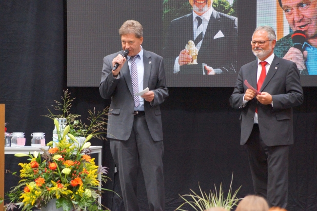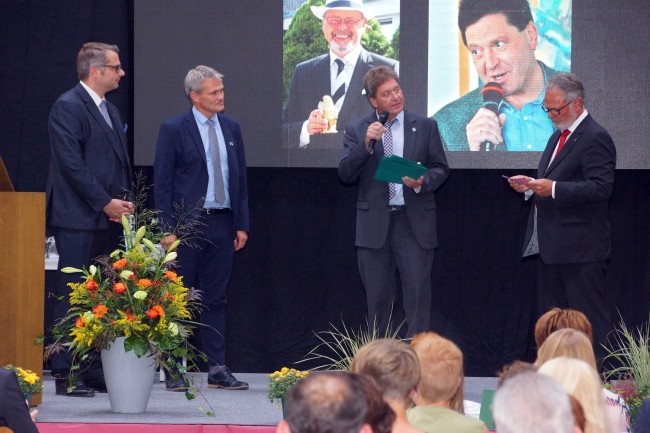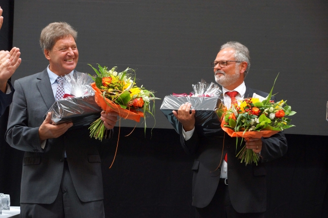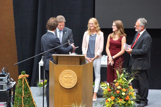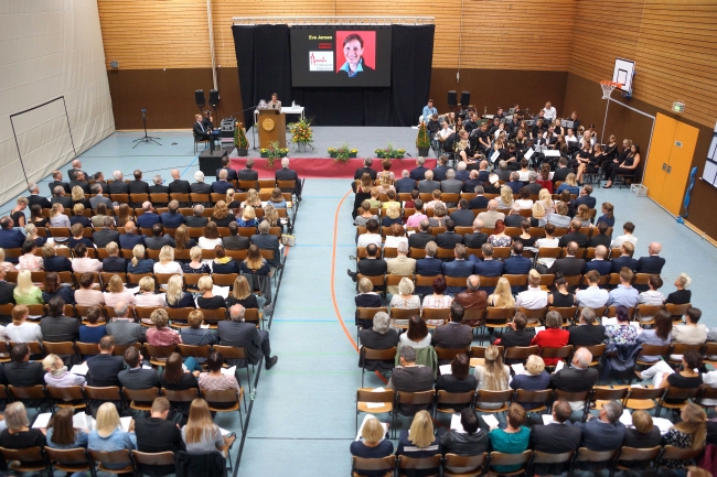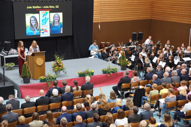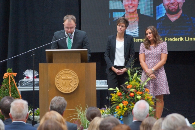 Besonders herzlich fiel dann die Verabschiedung durch die Schülersprecherinnen Jule Steffen und Julia Nies aus. Sie betonten, dass sie bei der Schulleitung immer ein offenes Ohr für ihre Anliegen gefunden hätten und immer ein „Gespräch auf Augenhöhe“ stattgefunden habe. Die Devise von Berthold Schleime sei gewesen: „Die Schule ist wichtig, die Schüler sind noch wichtiger.“ Die erfrischenden und herzlichen Videobeiträge einzelner Klassen, die die Rede ergänzten, führten nicht nur bei der scheidenden Schulleitung zu der einen oder anderen Träne. Im Vorfeld der Veranstaltung hatten jede Klasse und auch drei ehemalige Kolleginnen ein Video zum Abschied produziert. Für die Eltern dankte Jens Eberts den scheidenden Schulleitern. Er betonte die großen Leistungen der beiden, die für das Gymnasium tatsächlich eine „großartige Ära“ bedeutet hätten. Sie hätten in den zwanzig Jahren im Amt auch ein „Fest der Ideen“ für ihre Schule initiiert. Martin Dornseifer sprach für die ehemaligen Schülerinnen und Schüler und dankte für das überaus große Engagement der Schulleitung in der Zusammenarbeit mit den schulischen Vereinen. Berthold Schleime und Jürgen Lambrecht dankten anschließend mit bewegenden Worten allen Anwesenden und besonders denjenigen, mit denen sie über einundzwanzig Jahre zusammengearbeitet haben. Neben Schülern, Eltern und Lehrern hoben sie besonders die Patres der Missionare von der Heiligen Familie, die Schulsekretärinnen und die Hausmeister hervor.