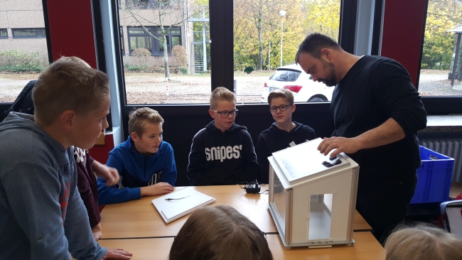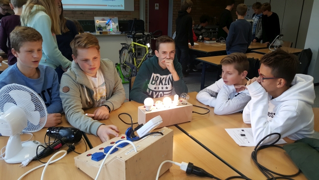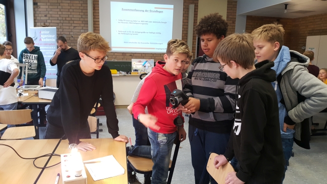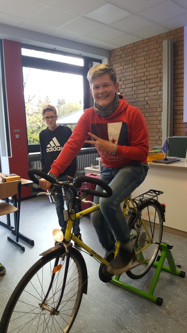 Der neue 8er Kurs der Junior-Ingenieur-Akademie befasst sich in diesem Schulhalbjahr mit dem Thema „Energiewende“. Hierzu bekamen wir Besuch von der Verbraucherzentrale NRW in Person von Matthias Ansbach, der mit den Teilnehmerinnen und Teilnehmern des JIA-Kurses einen Photovoltaik-Workshop im Physikraum durchführte. Neben einem einführenden Vortrag zu Photovoltaikanlagen konnten die Schülerinnen und Schüler an unterschiedlichen Stationen die Leistung eines Solarpanels unter verschiedenen Bedingungen testen, den Energieverbrauch von diversen Leuchtmitteln (LEDs, Glühlampe, Halogenlampe und Gaslampe) bestimmen und eine Solaranlage an einem Modellhaus ausprobieren. Dass Energie nicht umsonst ist, konnte man dann direkt an „Olga“ testen, indem man kräftig in die Pedale trat und feststellen konnte, welche Energiemengen nötig sind, um bestimmte Verbraucher im Haushalt, wie z.B. eine Lampe, zu betreiben. An dieser Stelle bedankt sich der JIA Kurs nochmals ganz herzlich bei Herrn Ansbach für den Workshop und Herr Walter freut sich, dass sein altes Studentenfahrrad in dieser Stunde eine tollen Namen bekommen hat.