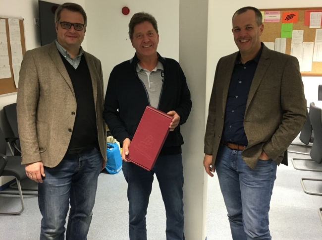 Der Vorsitzende bedankte sich bei Berthold Schleime für seine langjährige und unermüdliche Arbeit zugunsten des Ehemaligenvereins und überreichte ihm ein kleines Präsent.