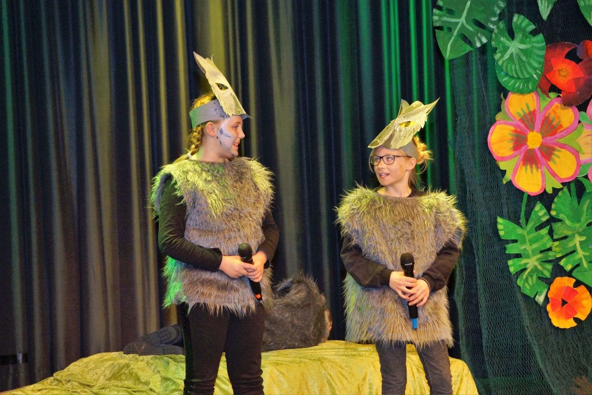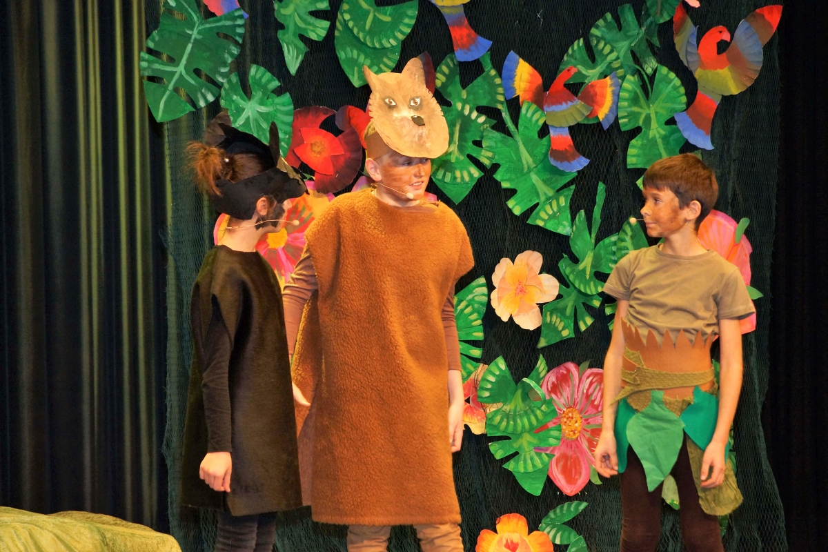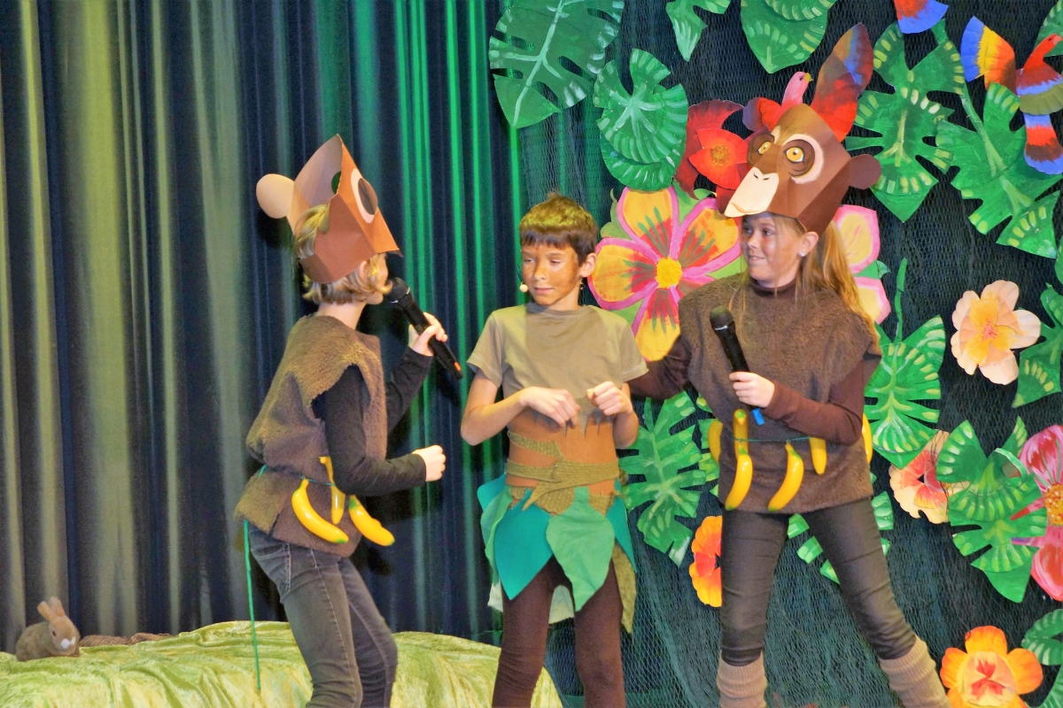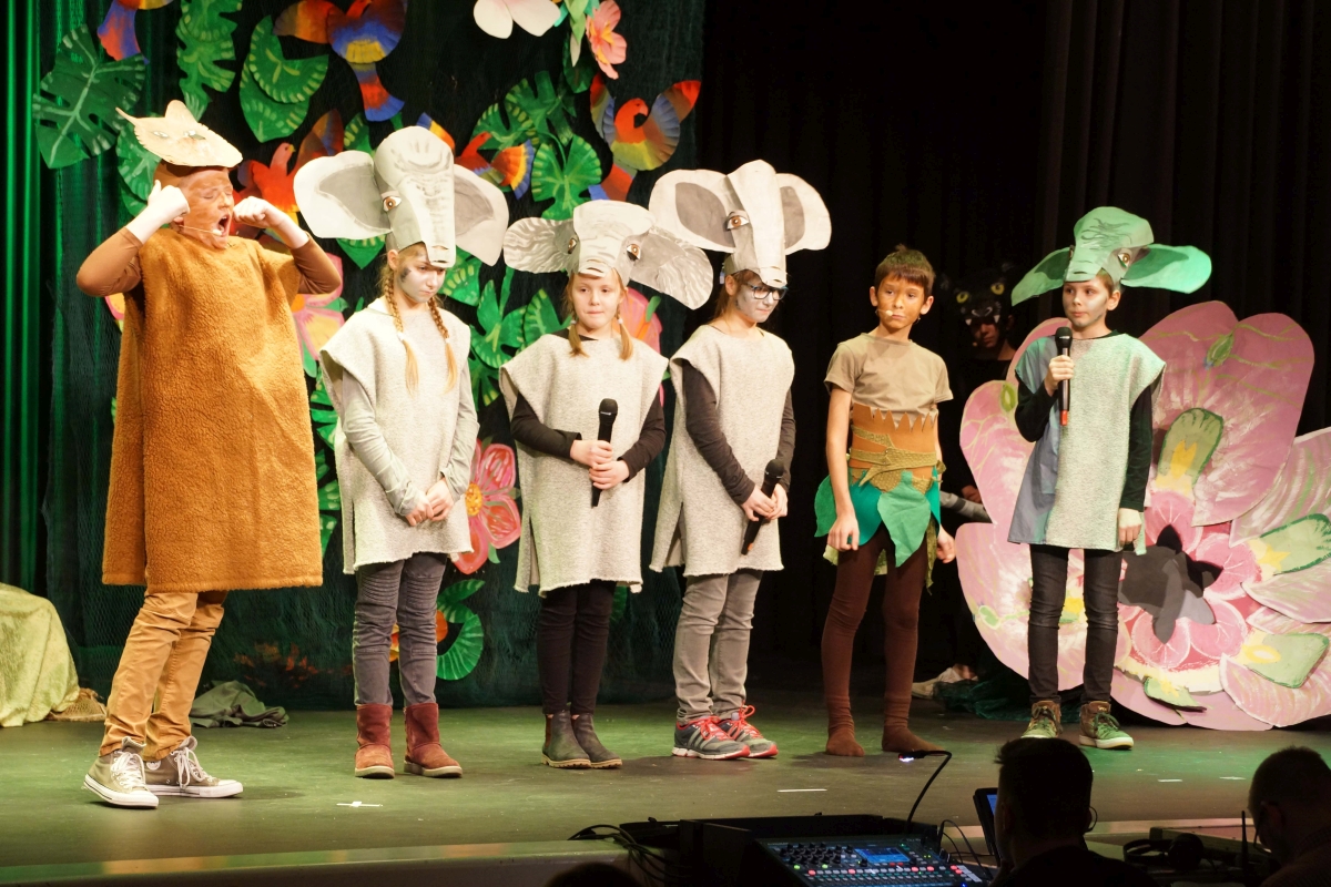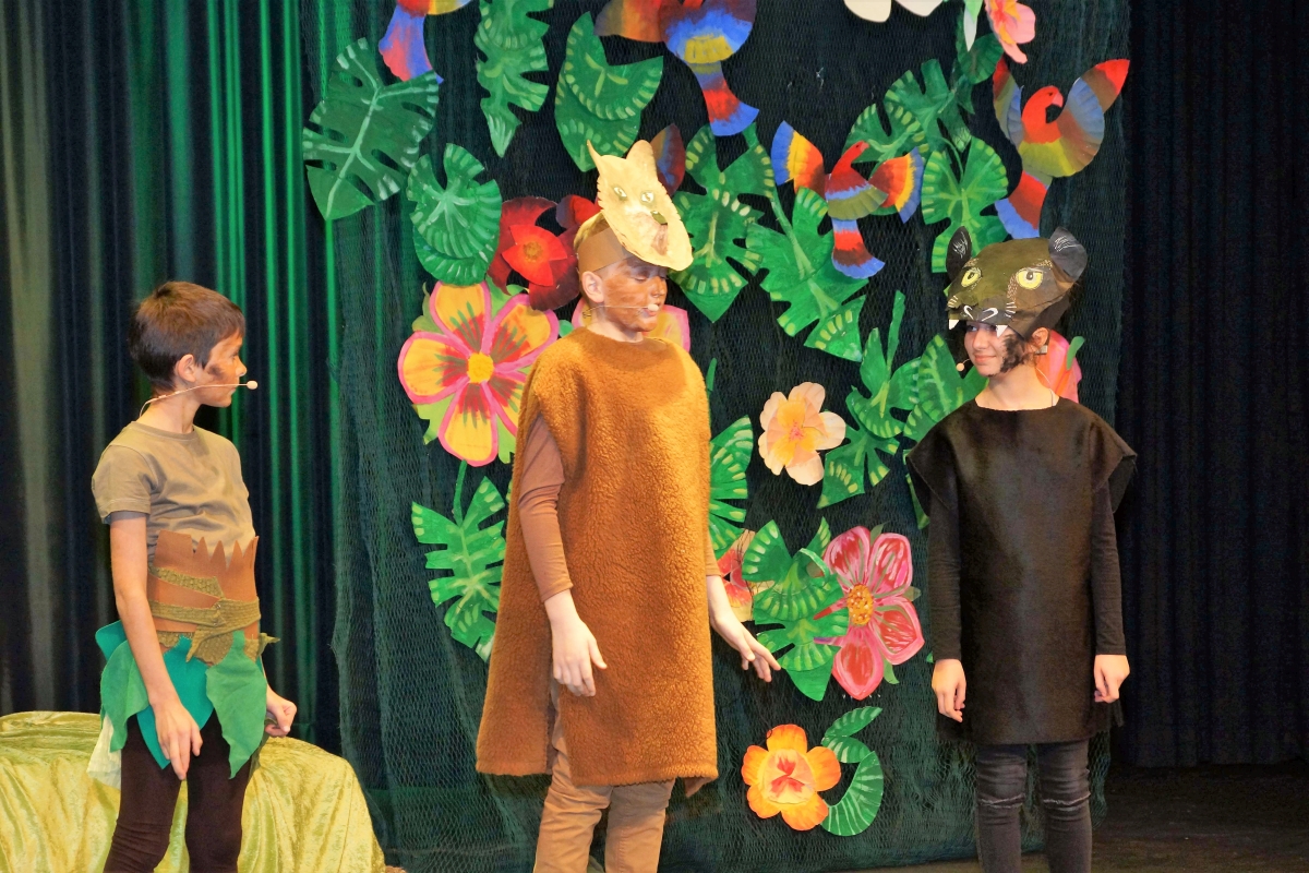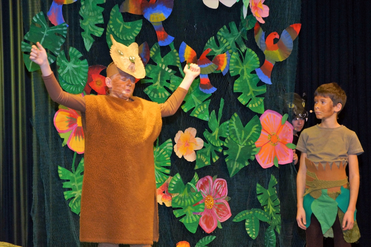 Nahezu 800 Besucher füllten in den beiden Aufführungen des „Dschungelbuchs“ der Musical-AG der Unterstufe des Gymnasiums Maria Königin am vergangenen Sonntag, dem 10. Februar 2019, das PZ in Meggen. Vor einer bunten Urwald-Kulisse, in farbenprächtigen Kostümen und hinter mit viel Liebe zum Detail angefertigten Masken führten über 70 Schülerinnen und Schüler den Klassiker des britischen Autors Rudyard Kipling in einer überarbeiteten Fassung auf. Unterstützt wurden sie dabei von der MK-Band, der Tanz-AG und der Technik-AG. Der große Schlussapplaus eines begeisterten Publikums wurde mit einer Zugabe von Mogli, Balu und Co. belohnt.
