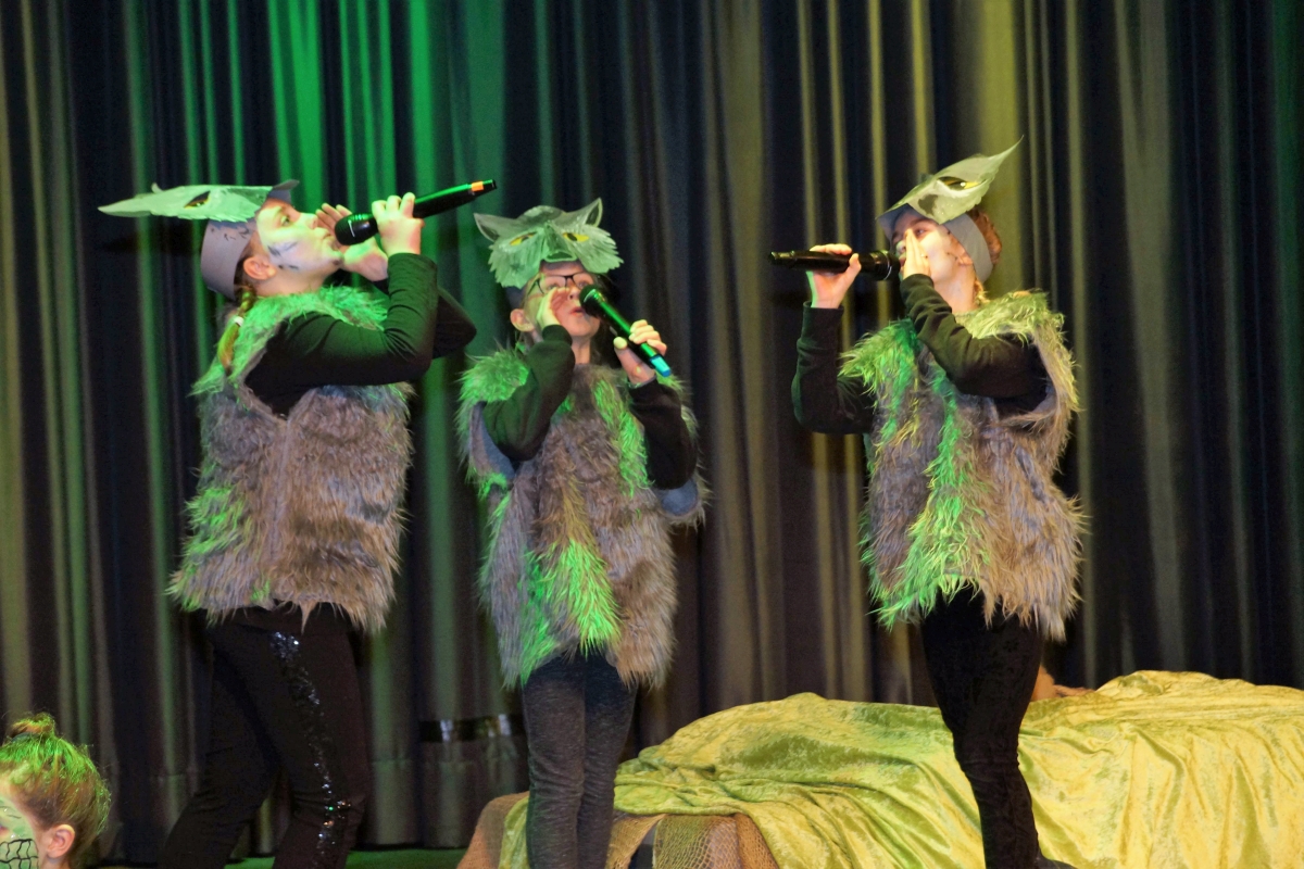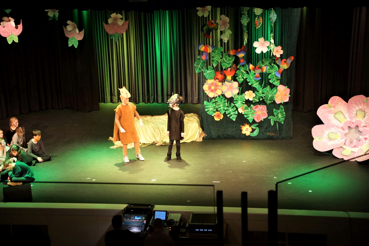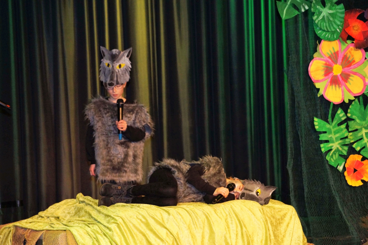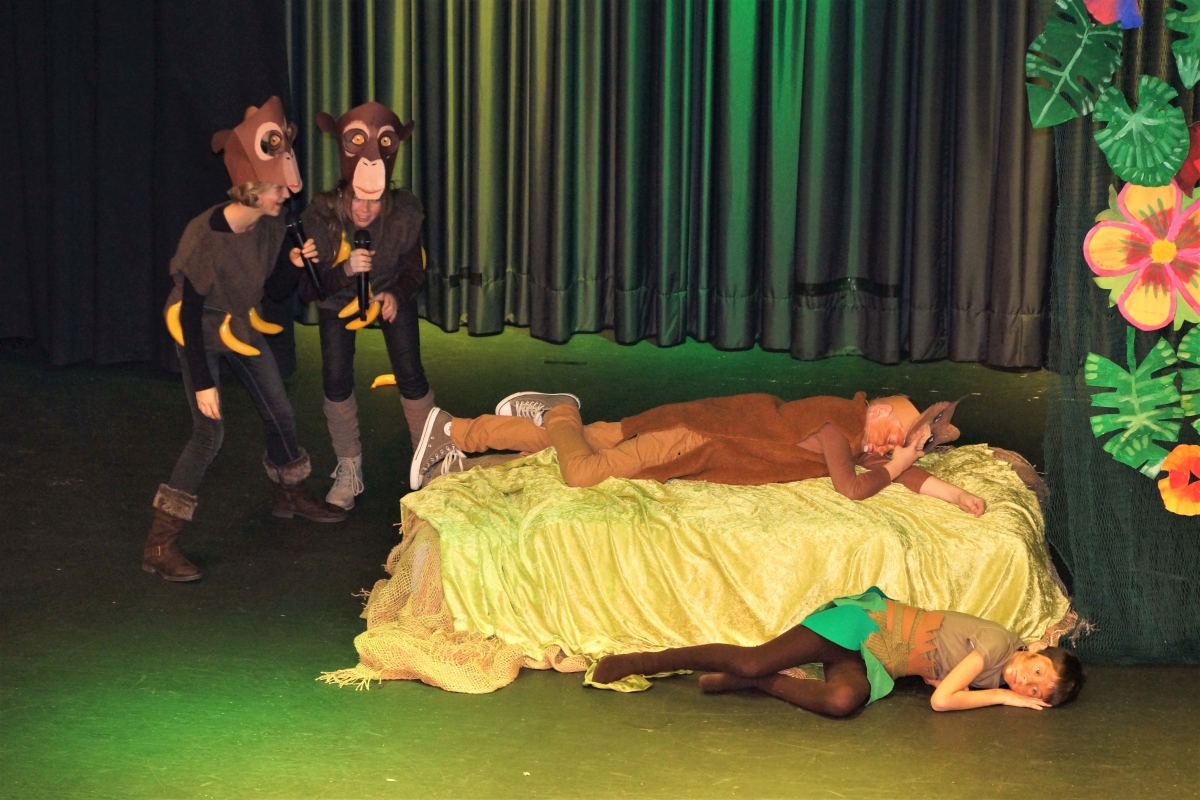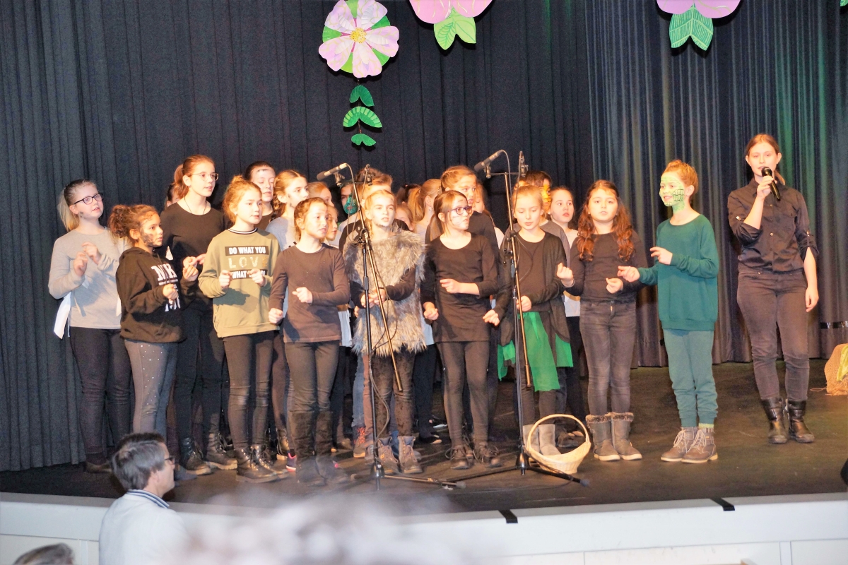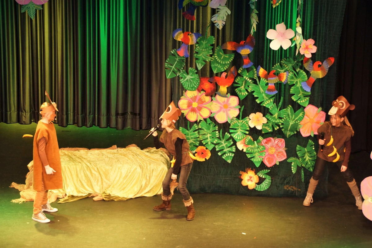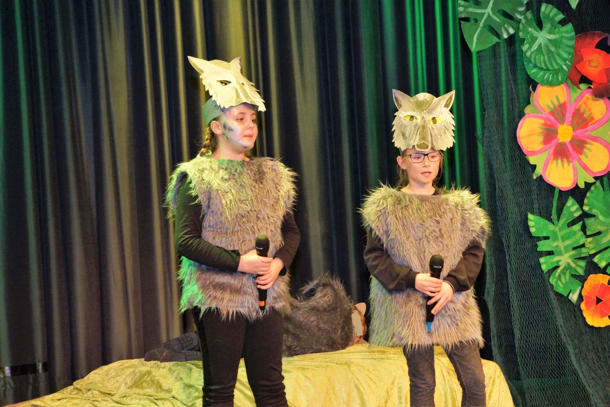 Nahezu 800 Besucher füllten in den beiden Aufführungen des „Dschungelbuchs“ der Musical-AG der Unterstufe des Gymnasiums Maria Königin am vergangenen Sonntag, dem 10. Februar 2019, das PZ in Meggen. Vor einer bunten Urwald-Kulisse, in farbenprächtigen Kostümen und hinter mit viel Liebe zum Detail angefertigten Masken führten über 70 Schülerinnen und Schüler den Klassiker des britischen Autors Rudyard Kipling in einer überarbeiteten Fassung auf. Unterstützt wurden sie dabei von der MK-Band, der Tanz-AG und der Technik-AG. Der große Schlussapplaus eines begeisterten Publikums wurde mit einer Zugabe von Mogli, Balu und Co. belohnt.