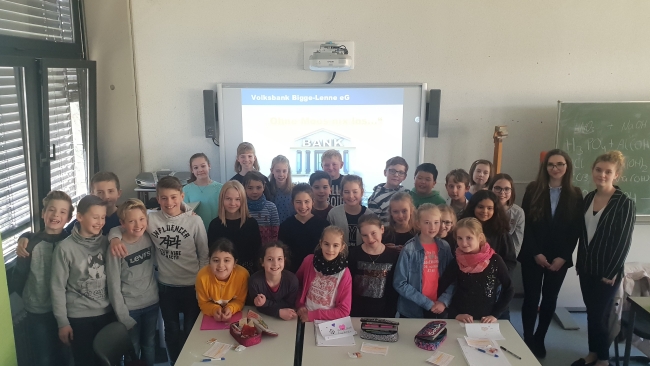 An insgesamt drei Schulvormittagen am 15.03., 18.03. und 22.03.2019 wurden die Jüngsten unserer Schule durch die Volksbank Bigge-Lenne über bewusstes Handeln mit Geld informiert. Schwerpunkte der Informationsveranstaltung waren Fragen rund ums Geld: Woher kommt das Geld? Wohin geht es? Was kann Geld eigentlich und wieso brauchen wir es? Wie landet man eigentlich in einer „Schuldenfalle“ – und wie kann ich mich davor schützen? Die Schülerinnen und Schüler konnten mit ihren alltäglichen Erfahrungen an die Inhalte anknüpfen. Besonders aktiv wurden sie, als sie als Detektive auf die Suche nach Sicherheitsmerkmalen eines Scheines gehen durften und Falschgeld enttarnen konnten. Auch das Ausfüllen eines Überweisungsscheins wurde den Schülerinnen und Schülern unter fachkundiger Beratung von Frau Iarossi, Frau Muja und Frau Maluche näher gebracht.