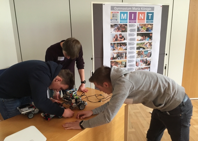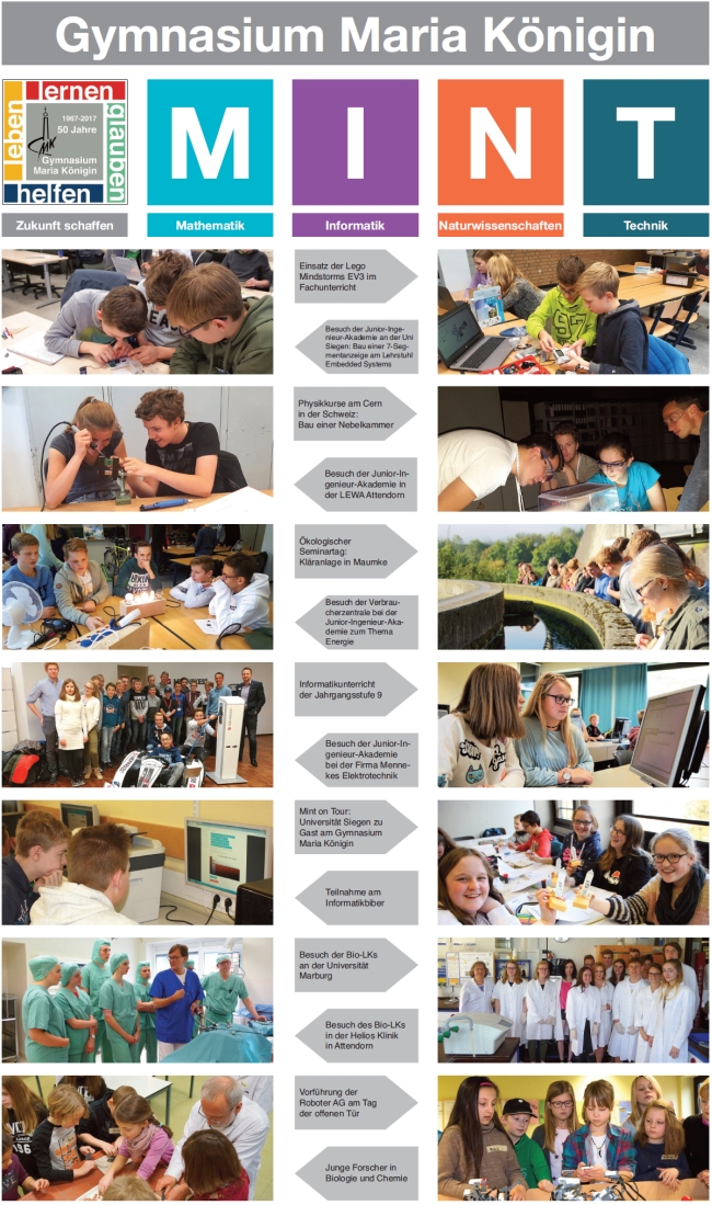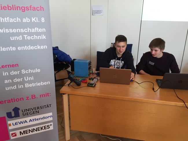 Während am letzten Dienstag vor den Osterferien der Kurs der Junior-Ingenieur-Akademie (JIA) der Klasse 8 den Fachbereich „Embedded Systems“ der Universität Siegen besuchte, hieß es für den Projektkurs Informatik der Jahrgangsstufen Q1 und Q2 die vielfältigen MINT-Aktivitäten unserer Schule im Kreishaus in Olpe auf dem MINT-Tag vorzustellen. Neben den eigenen Projekten wie beispielsweise „Smart Hof“ und einem Vermessungsroboter, konnten die Besucher des Standes sich über die unterschiedlichsten MINT-Aktivitäten, vor allem auch der Junior-Ingenieur-Akademie unserer Schule, informieren.
