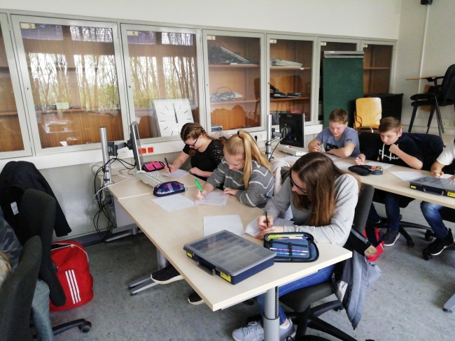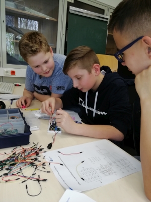Ziel des Besuches der Junior-Ingenieur-Akademie an der Universität Siegen war es, die zuvor im Unterricht theoretisch erarbeiteten Grundlagen zur Steuerungstechnik in die Praxis umzusetzen. Hierzu planten die Schülerinnen und Schüler morgens eine Schaltung zur Steuerung einer 7-Segment-Anzeige, wie sie noch häufig in digitalen Radioweckern oder Tankstellenanzeigen eingesetzt wird. Nach einer kurzen Pause, die zur Stärkung in der Mensa genutzt wurde, stand am Nachmittag der Praxisteil auf dem Programm, in welchem die Kursteilnehmer die zuvor erstellte Schaltung am Schaltbrett umsetzten. Der JIA-Kurs bedankt sich an dieser Stelle nochmals ganz herzlich für die tolle Organisation und Betreuung durch Herrn Otterbach.