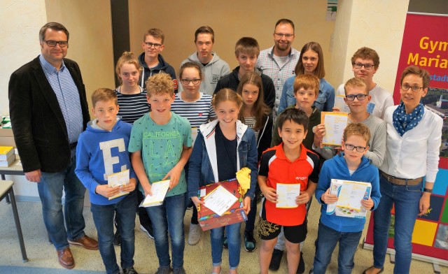 Der Känguru Wettbewerb gehört seit vielen Jahrzehnten in zahlreichen Schulen in Deutschland zu den beliebtesten Mathematik-Wettbewerben. Bundesweit nahmen in diesem Jahr stolze 968.598 Schülerinnen und Schüler aus den Jahrgangstufen drei bis zwölf teil. Auch am Gymnasium Maria Königin versuchen sich fast jedes Jahr über hundert Schülerinnen und Schüler an den kniffligen und anspruchsvollen Aufgaben. Einige Leistungen sind dabei so gut, dass sie mit einem Preis belohnt werden. Einen dritten Preis erhielten in diesem Jahr Franziska Rameil (5c), Tony Santolaya Wu (6c), Sebastian Berens (6c) und Justus Alff (6c). Ein zweiter Preis ging an Henri Wadsack (6c), Moritz Schmidt (6a) und Daniel Jouhet (6c).