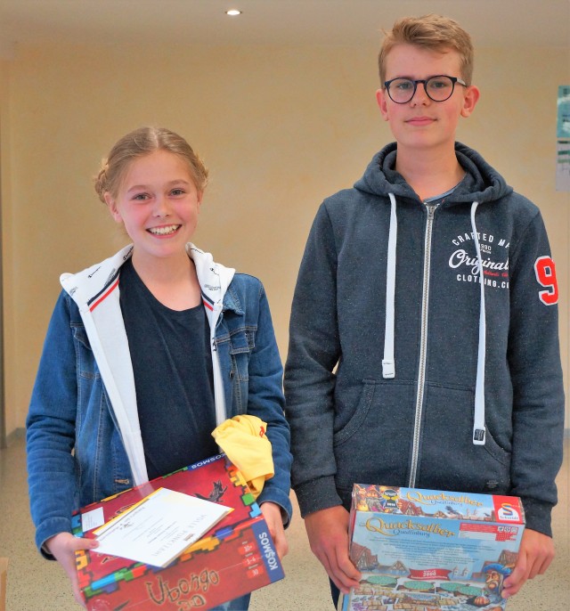 Doch die Leistung zweier Schüler überragte alles: Cornelius Mester (8a), der schon in den vergangenen Jahren mit sehr guten Leistungen auf sich aufmerksam gemacht hatte, beantwortete 93% der Fragen richtig und erhielt dafür einen ersten Preis. Cornelius ist damit unter den besten 0,4% seines Jahrgangs. Eine wirklich tolle Leistung! Doch eine Schülerin schnitt noch besser ab und darf sich das beste Känguru an MK seit Beginn des Wettbewerbs nennen: Lea Richart-Willmes (6b) beantwortete jede einzelne Frage korrekt! Das hatte an unserer Schule noch nie jemand geschafft. Und auch bundesweit passiert das nur sehr selten. Von den 178.759 Sechstklässlern, die in diesem Jahr an dem Wettbewerb teilgenommen haben, konnten nur 100 Schüler alles richtig beantworten. Das sind gerade einmal 0,05% des Jahrgangs. Eine wahrhaft beeindruckende Leistung von Lea, die ebenfalls mit einem ersten Preis honoriert wurde.