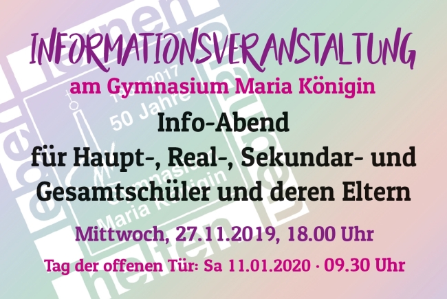 Einige der Seiteneinsteiger werden auch dabei sein, wenn das Gymnasium Maria Königin über die Oberstufe informiert. Für interessierte Schülerinnen und Schüler von Sekundar-, Real-, Haupt- und Gesamtschulen sowie deren Eltern findet am Mittwoch, dem 27.11. um 18 Uhr diese Informationsveranstaltung am Gymnasium Maria Königin statt.