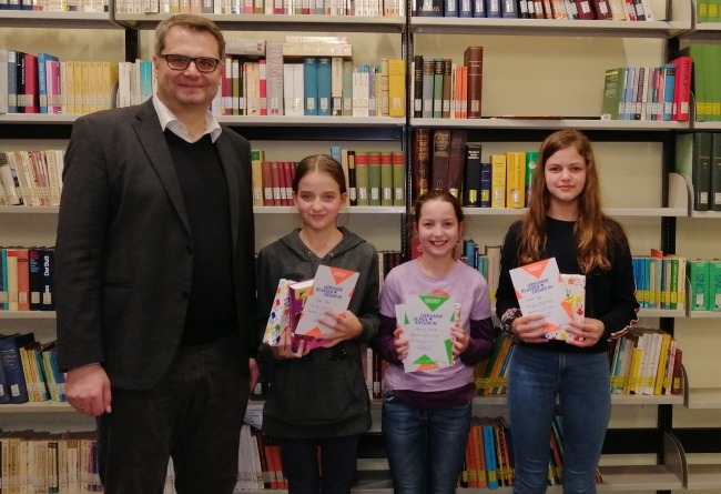 Clarissa Sprecker (Mitte) aus der Klasse 6c ist Schulsiegerin im Lese-Wettbewerb. Clarissa las aus „Mio, mein Mio“ von Astrid Lindgren und konnte die Jury damit überzeugen. Fast genauso gute Leserinnen sind Julia Fleper, 6a (links) und Amelie Löhr aus der 6b (rechts), die den Wettbewerb jeweils in ihren Klassen gewinnen konnten. Schulleiter Fabian Borys gratulierte der Siegerin, die unsere Schule nun beim Kreisentscheid im März auf der Burg Bilstein vertreten wird. Der Vorlesewettbewerb findet in jedem Jahr bundesweit statt.