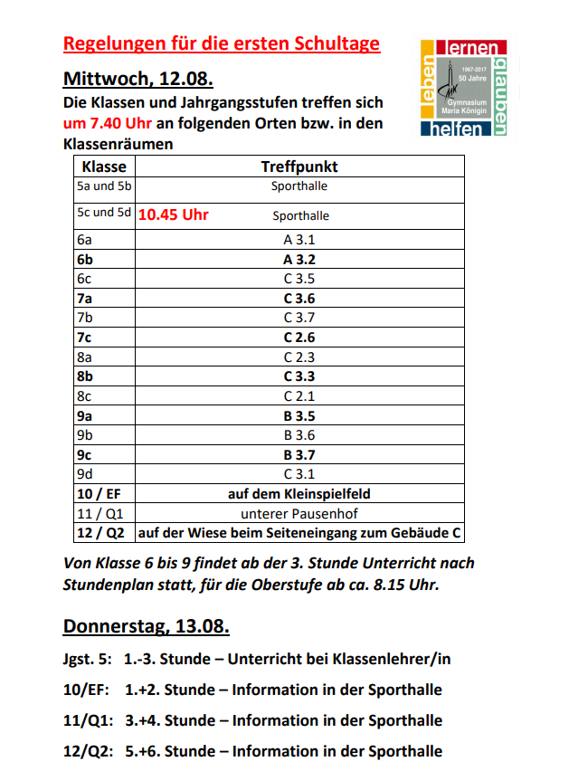 Mit dem Beginn des neuen Schuljahres gilt an allen Schulen und damit selbstverständlich auch am Gymnasium Maria Königin die Maskenpflicht. Eine Mund-Nasen-Bedeckung ist von Schülern und Lehrern zu tragen. Das gilt auch für die Hin- und Rückfahrt in den Schulbussen. Diese Regelung ist wichtig zur Vermeidung von Infektionen mit Covid 19 und wird daher von uns sehr ernst genommen. Wir wissen aber auch, dass dies eine Belastung für den Schulalltag sein wird. Wir werden als Schulgemeinde das Beste aus der Situation machen und die Freude an der Schule nicht verlieren.