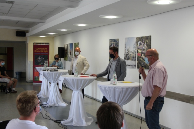 Am 24. August 2020 stand die heimische Politik im Mittelpunkt der Jahrgangsstufen Q1 und Q2. Zu diesem Zweck stellten sich die Bürgermeisterkandidaten aus Lennestadt sowie Kirchhundem einer Podiumsdiskussion. Dabei duellierten sich die beiden Kirchhundemer Kandidaten Herr Reinery und Herr Jarosz im Konferenzraum, während die Kandidaten der Stadt Lennestadt Herr Puspas (CDU), Herr Sonntag (SPD), Herr Dr. Kaiser (Die Grünen/Bündnis90) sowie Herr Prevorcic (Die Linke) in der Turnhalle aufeinander trafen. Frau Bauer (UWG) fiel leider krankheitsbedingt aus.