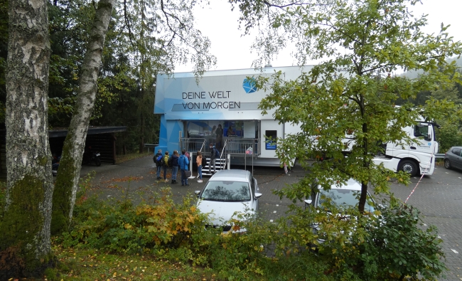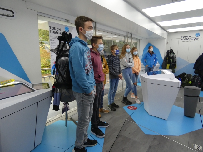 Einen Rundgang mit verschiedenen Stationen voller technischer Neuerungen konnten schon vor den Herbstferien Schülerinnen und Schüler von Jahrgangsstufe 8 bis 12 erleben. Der „Touch Tomorrow Truck“ der Dr. Hans Riegel-Stiftung bietet einen Einblick in die Arbeitswelt von morgen. Hierbei wurden sie unter anderem von den Mitarbeitern der Stiftung sowie der Bundesagentur für Arbeit durch einen virtuellen Rundgang begleitet.