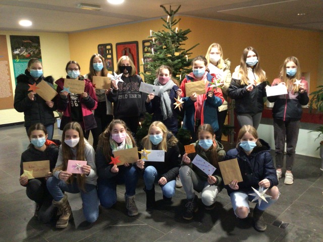 Zahlreiche Schülerinnen und Schüler unseres Gymnasiums, wie hier Schülerinnen der 7a, haben sich an der Aktion „Weihnachtspost für Senioren“ beteiligt und persönliche Briefe mit guten Wünschen, Geschichten und Bildern verfasst. Die Briefe werden nun über das HANAH-Büro Lennestadt an Senioren verteilt, um diesen so eine Freude zu Weihnachten zu machen.