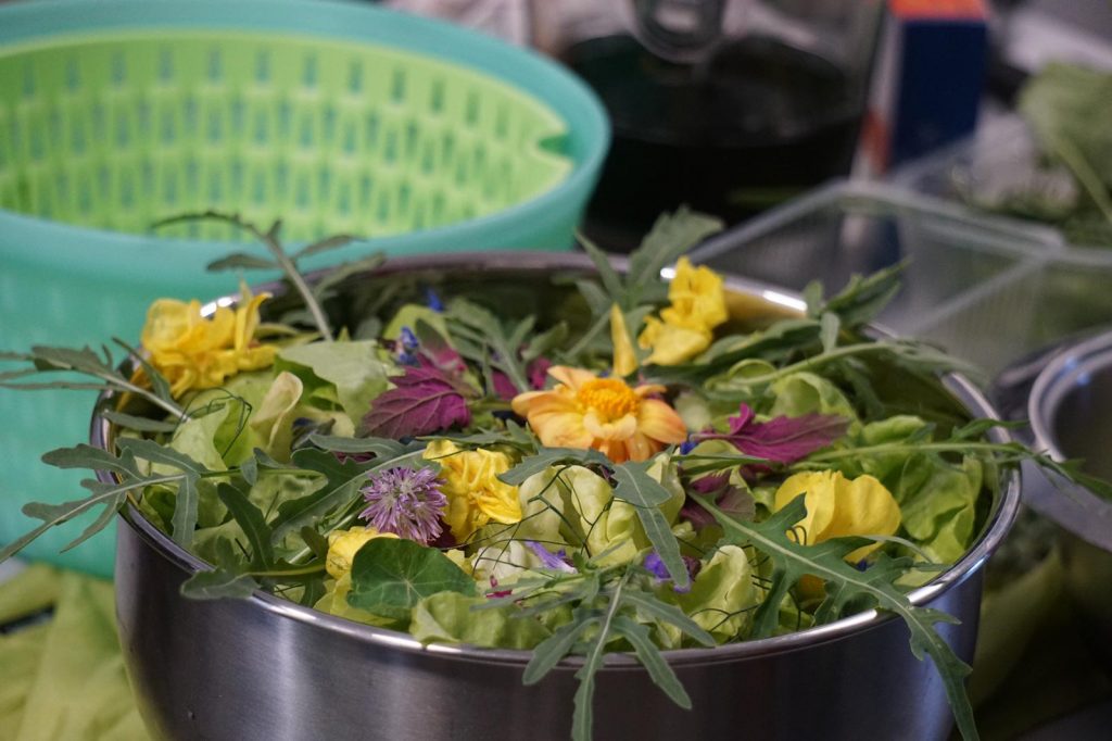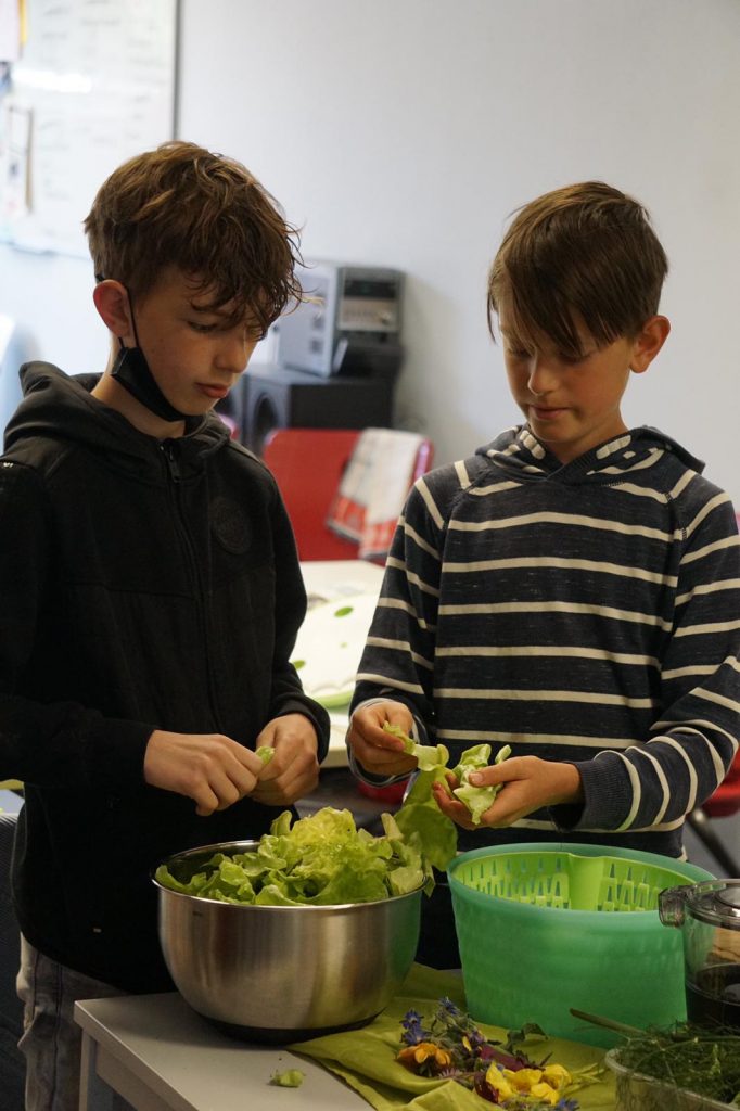 Möchte man nachhaltig kochen ist bei der Zusammenstellung von Rezepten zu beachten, dass man saisonale und regionale Produkte verwendet, die Lebensmittel pflanzenbetont auswählt und so wenig Verpackung wie möglich nutzt, am besten natürlich keine. Passend zu diesen Grundsätzen besuchten die SchülerInnen am ersten Tag die Agraringenieurin und Umweltpädagogin Anita Jung in ihrer Gärtnerei in Langenei, die die Grundsätze der Biolandwirtschaft vorstellte, zum Beispiel wie wichtig torffreie Erde und Biosaatgut sind. Sie berichtete von den täglichen Pflichtarbeiten in einer Gärtnerei und von dem straffen Terminkalender, den die Pflanzen vorgeben. Alles im allen wurde den Schülern klar, wie viel Arbeit und Zeitaufwand hinter dem Anbau von Biogemüse steckt. Weiter lernten sie, dass man von einer Pflanze meist alles essen kann, so zum Beispiel die Blätter der Kohlrabi.