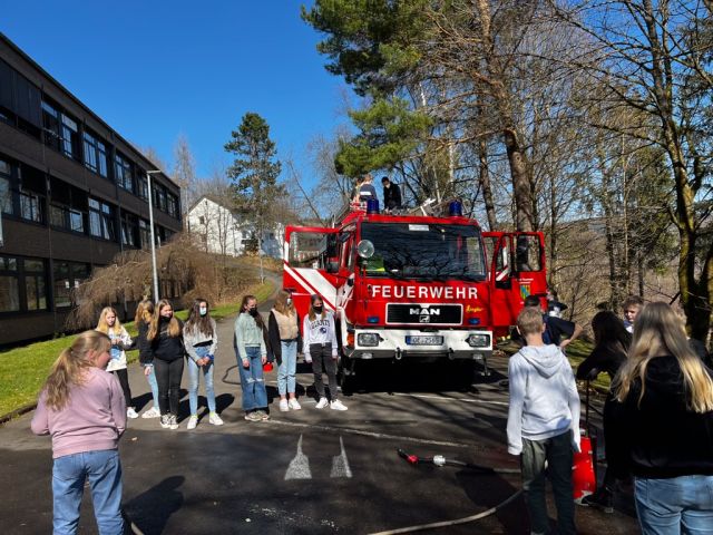Gerade in diesen Tagen der großen Hitze und Trockenheit wird die Bedeutung einer gut aufgestellten Feuerwehr und von Kenntnissen im Brandschutz deutlich. Am Gymnasium Maria Königin hat daher am Ende des letzten Schuljahres ein Tag der Brandschutzerziehung für die Jahrgangstufe 7 in Kooperation mit der Feuerwehr Lennestadt stattgefunden.