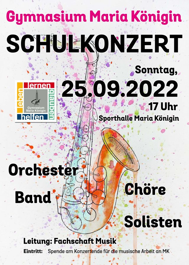 Ein Schulkonzert findet am 25. September um 17.00 Uhr in der Sporthalle des Gymnasiums Maria Königin statt. Über 100 Mitwirkende spielen und singen klassische und moderne Melodien aus unterschiedlichen Genres. So spielt das Blasorchester mit über 60 Mitwirkenden, hauptsächlich ehemalige Schülerinnen und Schülern, die „Pasadena“ von Jakob de Haan, das berühmte „Loch Lomond“ und die bekannte „Forrest Gump Suite“. Ferner unterhalten der Unterstufenchor, die Big Band, Mittel- und Oberstufenchöre sowie Solistinnen das Publikum mit attraktiven Stücken. Eigens aus Weimar anreisen wird die Gesangsstudentin und Abiturientin von 2021, Madeleine Wulff. Der Eintritt ist frei, es wird am Ende um eine Spende gebeten.